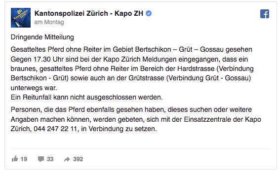 Gegen 17:30 Uhr erhielt die Kantonspolizei Zürich mehrere Anrufe, dass im Gebiet Bertschikon, Grüt und Gossau ein gesatteltes Pferd ohne Reiter gesichtet worden sei. Ein Reitunfall konnte nicht ausgeschlossen werden. Sofot machten sich mehrere Polizeipatrouillen auf die Suche, wie «zueriost.ch» berichtet.