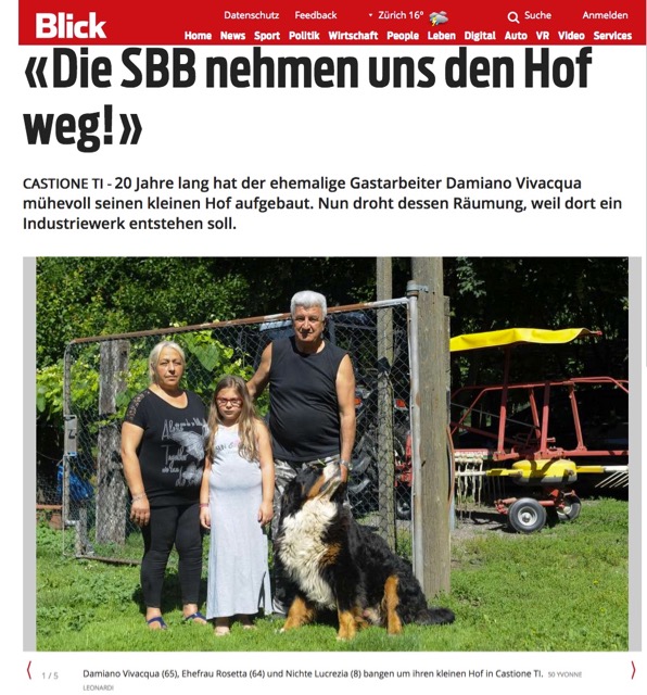 Die Familie Vivaqua erfuhr kürzlich über einen TV-Bericht von den Plänen der SBB. Bis 2026 soll in Arbedo-Castione TI auf 150'000 Quadratmetern das neue Werk für den Fahrzeugunterhalt entstehen. Das nötige Land, welches der SBB zum Teil nicht selbst gehört, soll über Enteignungen geholt werden.