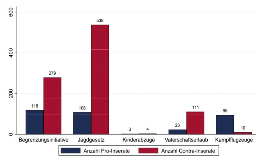 Die Untersuchung des «Année Politique Suisse» des Instituts für Politikwissenschaft der Universität Bern spricht eine klare Sprache: Zum Jagdgesetz wurden deutlich mehr Inserate geschaltet als zur Begrenzungsinitiative, obwohl diese medial stärker behandelt wird. Die Forschenden fanden 650 Inserate – was der siebthöchste Wert seit dem Start der Analysen 2013 ist.