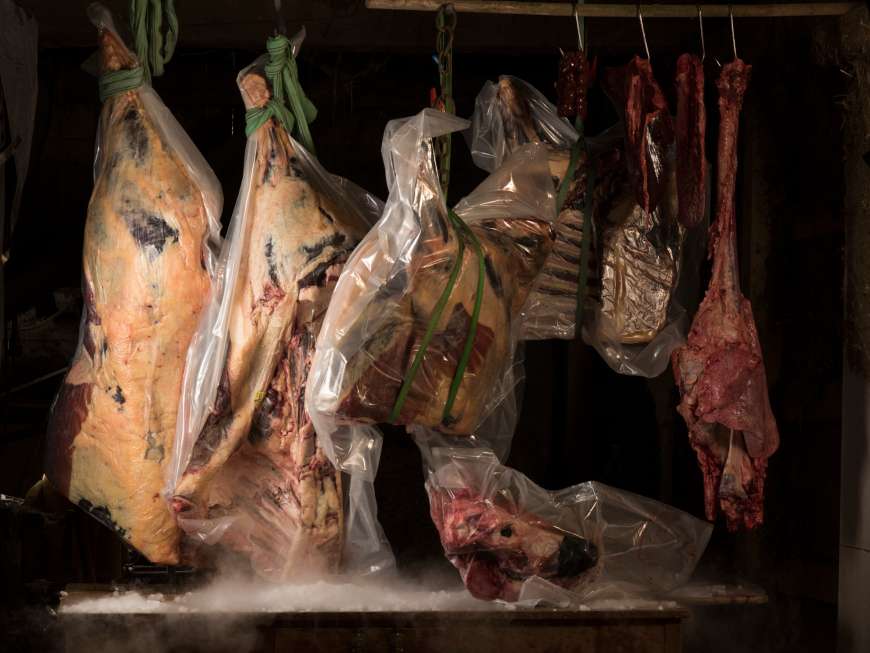 Knechts Variante dieses flämischen Klassikers wird im Kaufleuten grossformatig zu sehen sein, zusammen mit weiteren Fleisch-Fotos. Ein Teil des Bio-Rinds wurde im Vorfeld bereits vorbereitet, beispielsweise verwurstet, ein Viertel wird aufgehängt, vor Ort zerlegt und auf verschiedene Arten - nicht nur Sous-Vide - zubereitet. An verschiedenen Ständen sind Kostproben zum Preis von fünf Franken erhältlich.