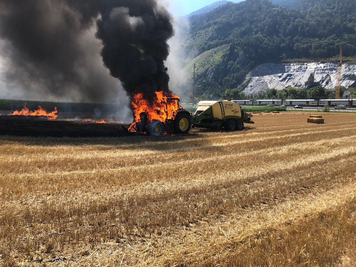Durch den Wind begünstigt fing nicht nur der Traktor, sondern auch ein Teil des Stoppelfeldes Feuer. Die Feuerwehr und Polizei Calanda konnte mit 15 Mann den Brand rasch unter Kontrolle bringen.