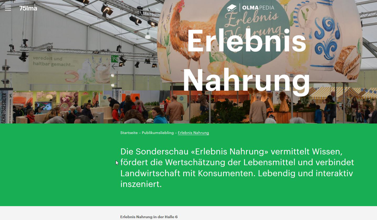 Die Olma-Pedia zeigt unter anderem die Plakat-Geschichte und hohe Besuche oder informiert über die Bedeutung der Gastkantone für die Messe. Unter der Rubrik Publikums-Liebling ist neben den Säuli-Rennen auch die Sonderschau "Erlebnis Nahrung" aufgeführt.