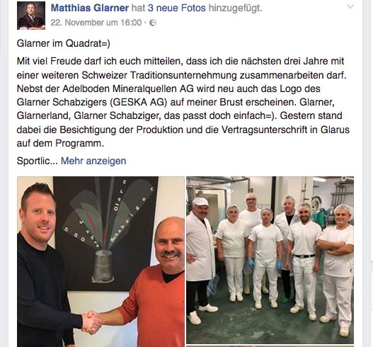 Laut Bericht wird Glarner die nächsten drei Jahre mit der Geska AG zusammenarbeiten. Neu erscheine auch das Logo des Glarner Schabzigers und der Geska AG auf Glarners Brust, neben jenem der Adelboden Mineralquellen, mit denen er Ende Oktober ebenfalls einen Dreijahresvertrag unterzeichnet hat.