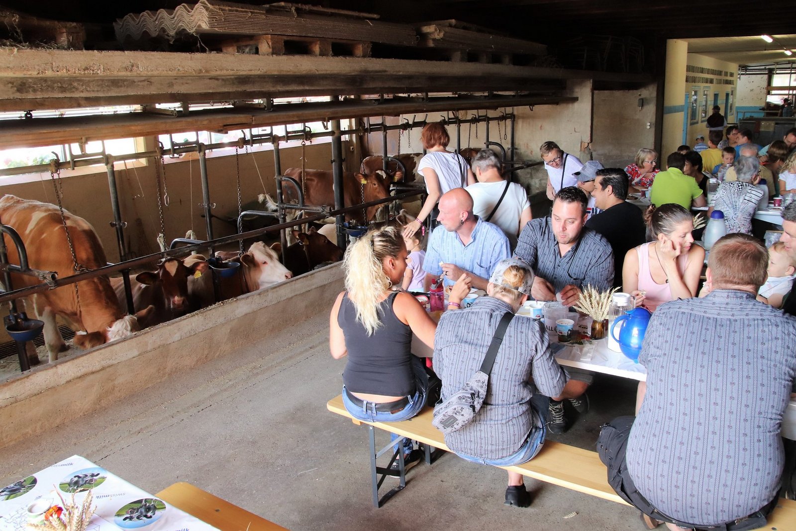 «Wir hatten bis am 31. Juli um 22 Uhr etwas mehr als 600 Anmeldungen von Erwachsenen. Dazu wurden 150 Kinder angemeldet», sagt Gastgeberin Agnes Zuber. Sie stellt fest, dass trendmässig immer später angemeldet werde. Man nehme auch eher spontan und ohne Anmeldung am Brunch teil. Auf dem weitläufigen Hof der Familie Zuber können die Gäste ihre Plätze selber auswählen. Jene mit kleineren Kindern bevorzugen die grosse Halle, in der sich auch ein grosse Sandhaufen befindet. Während die Eltern das reiche Angebot des vielseitigen Buffets geniessen, sind die lieben Kleinen auf dem Sandhaufen in Blicknähe beschäftigt und zufrieden. Andere bevorzugen hingen jene Plätze, auf denen man sich in Tuchfühlung mit dem Vieh befindet. Bei jedem Brunch dürfen die Gastgeber Agnes und Fritz Zuber vertraute Hände schütteln und langjährige Gäste begrüssen. Sie erhalten aber auch immer wieder Lob und Anerkennung für den tollen Anlass – und das Engagement aller Beteiligten, welche vor und hinter den Kulissen sich um das Wohl der Gäste kümmern.