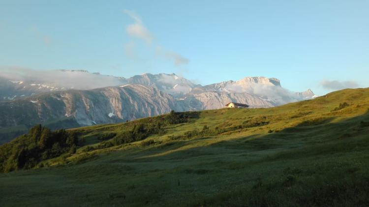 Der Tag beginnt bei uns um 5 Uhr. Raphael trägt die Käselaibe vom Vortag ins Salzbad und macht das Melkzeug bereit. Ich heize den Tiba-Herd ein. Mit Holz heizen wir das Wasser im Boiler. So verfügen wir immer über genug warmes Wasser für die Käserei, für die Küche, zum Heizen und Duschen. Nach einem gemeinsamen Kaffee bin ich bereit, die Kühe zu holen. Rocky wartet schon ganz ungeduldig auf seine Arbeit. Das Küheholen ist eine meiner Lieblingsaufgaben auf der Alp - aber zugleich manchmal auch die anstrengendste, wenn die Tiere andere Pläne als das Heimspazieren haben. Morgensport ist es auf jeden Fall.