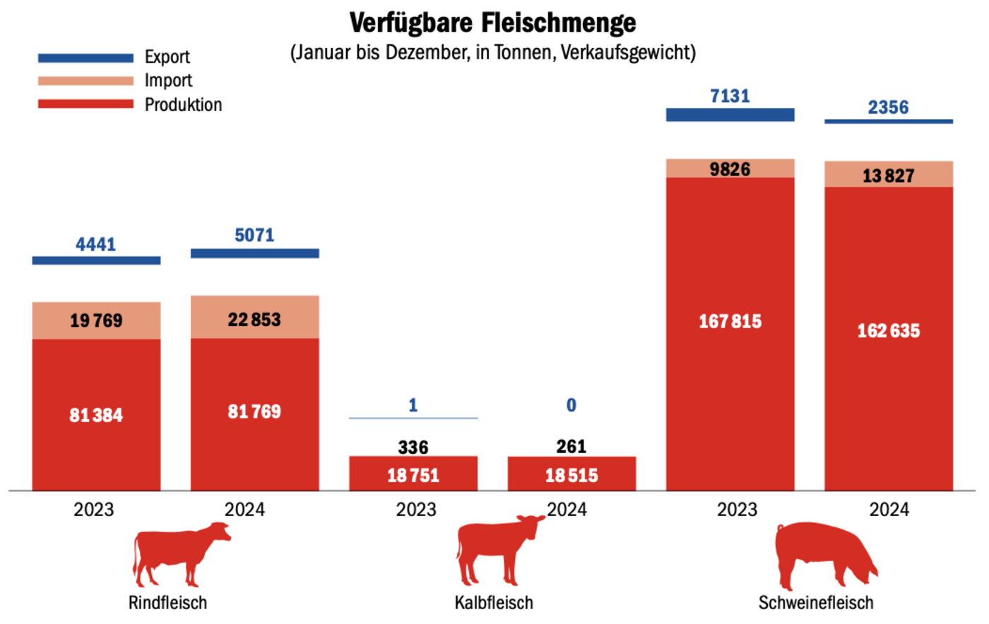 Im Detailhandel bezahlte der Konsument durchschnittlich 43.31 Franken für ein Kilo Kalbfleisch. Das sind 1,1 % weniger als noch im Jahr 2023. Trotz aller Absatzschwierigkeiten, unter dem Strich wurden im vergangenen Jahr im Detailhandel 2965 Tonnen Kalbfleisch verkauft, 0,6 % mehr als im Vorjahr. Die Inlandproduktion lag bei hohen 98,6 % und ist gegenüber dem Vorjahr 0,4 % höher. Die Inlandproduktion beim Kalbfleisch lag bei 18 515 Tonnen. Die Importe lagen bei 261 Tonnen. Insgesamt standen 18 775 Tonnen Kalbfleisch zur Verfügung, 1,6 % weniger als noch im Jahr 2023.