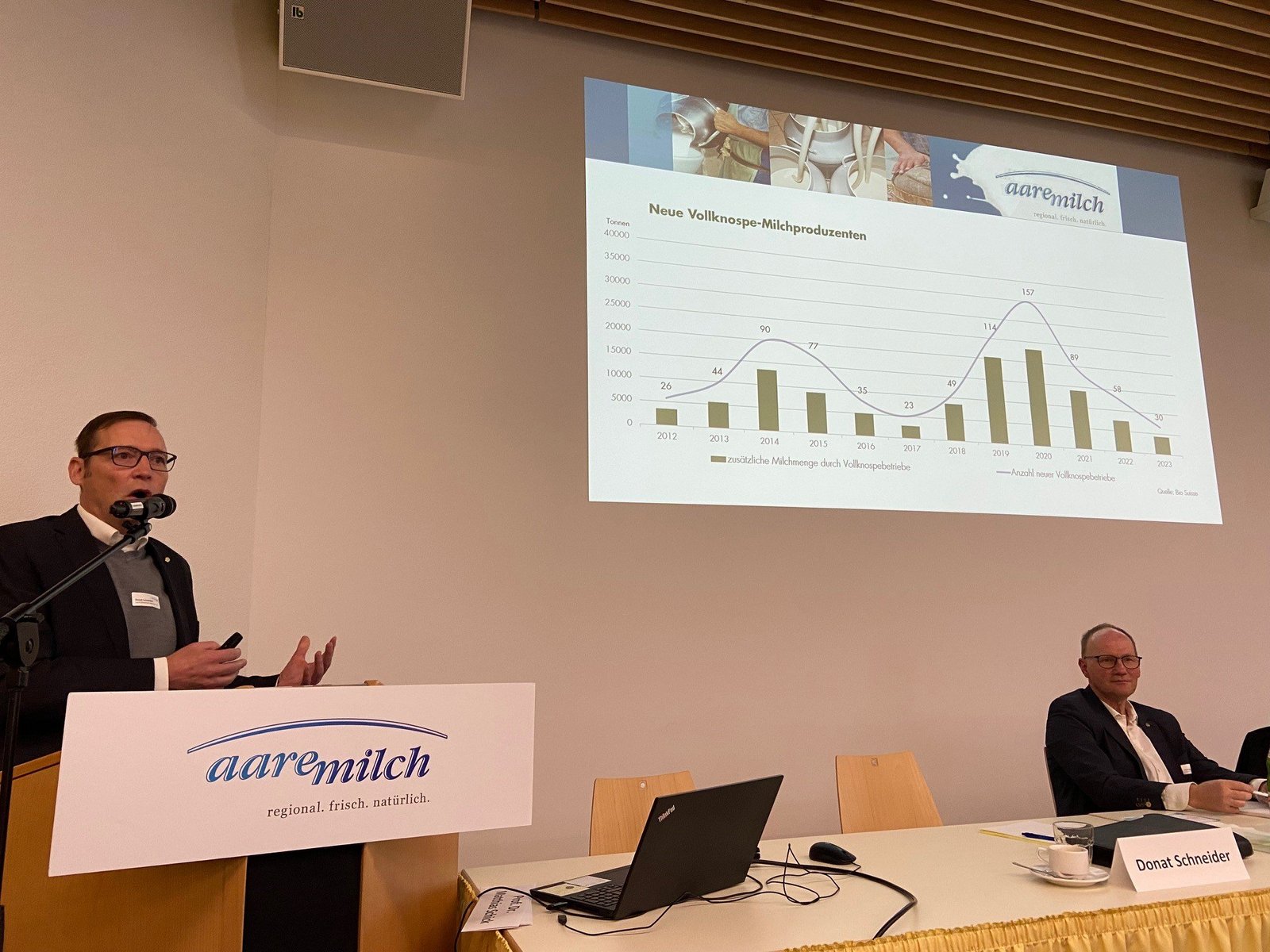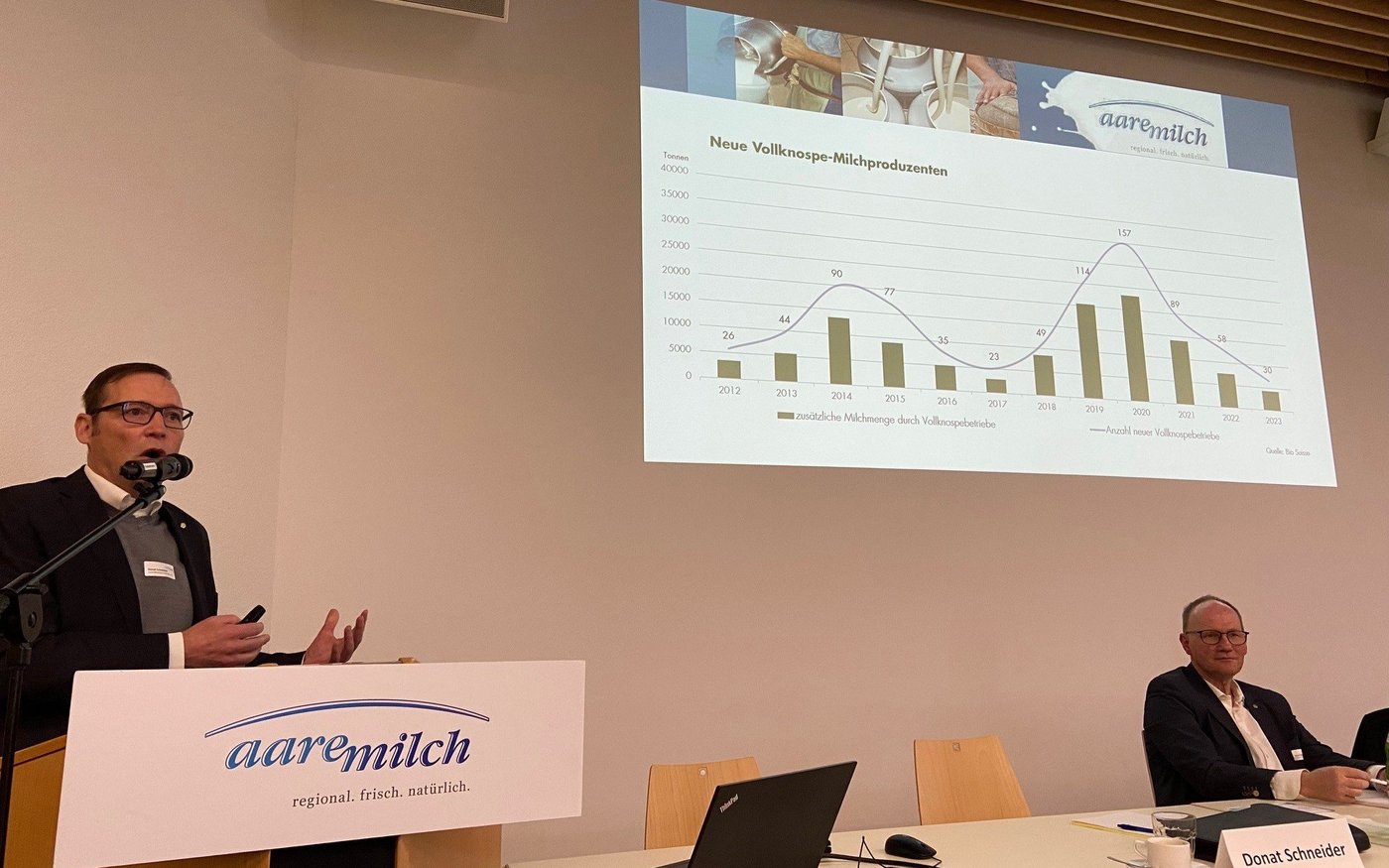 So betreibt die Migros-Milchverarbeiterin eine Abfüllanlage im Prestigeobjekt von Aaremilch, der Naturparkkaeserei in Oey im Berner Oberländer Diemtigtal. Die Versammlung sei in konstruktiver und guter Atmosphäre über die Bühne gegangen, so Schneider. Die Produzenten seien «happy und zufrieden».