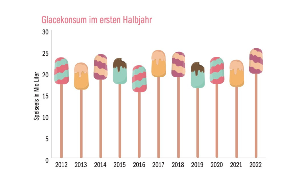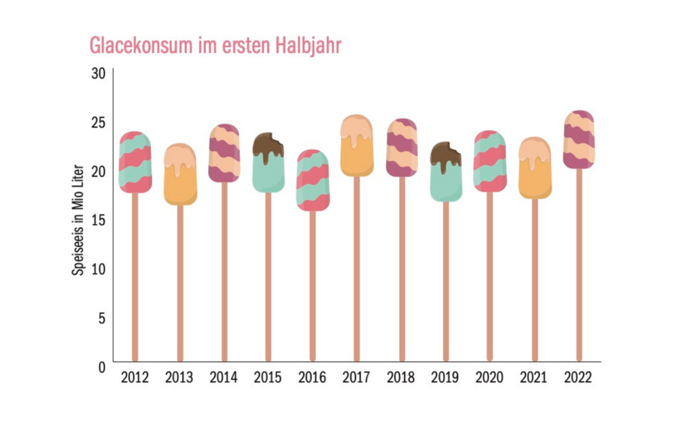 Insbesondere in der Gastronomie sei fast ein Drittel mehr Glace serviert worden als noch 2021, dies wohl wegen der vielen Feste, die wegen der Aufhebung der Corona-Massnahmen wieder gefeiert werden konnten. Der Konsum liege insgesamt wieder auf ähnlichem Niveau wie vor der Pandemie, so Glacesuisse.