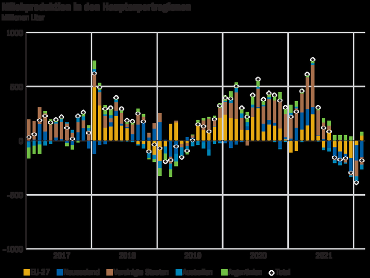 Die Entwicklung der Milchproduktion in den Hauptexportregionen der Welt ist ein wichtiger Indikator für die internationale Milchwirtschaft. Eine anhaltende Produktionssteigerung geht in der Regel mit regionalem oder globalem Druck auf die Milchpreise einher. Abgesehen vom Zeitraum November 2018 bis Juni 2019 befand sich die Produktion in der EU-27, Neuseeland, den Vereinigten Staaten, Australien und Argentinien von…