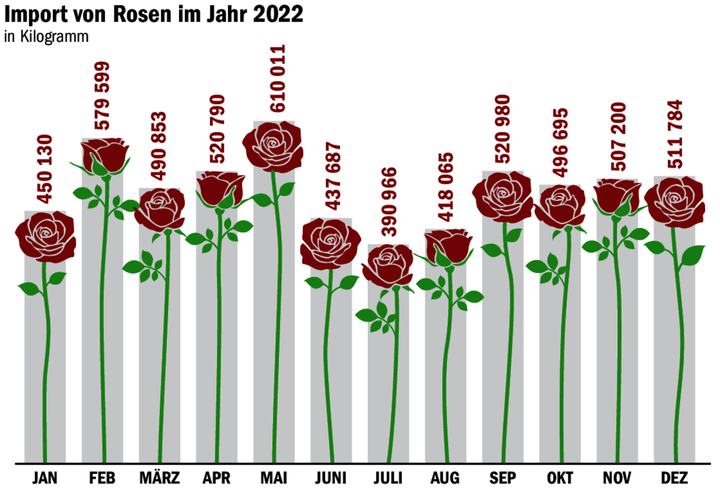In den Monaten Februar und Mai steigen die Rosenimporte an, Grund dürfte die Liebe sein. Saison haben diese Gewächse dann aber in der Schweiz nicht. Die Ökobilanz dieser Importe lässt zu wünschen übrig.