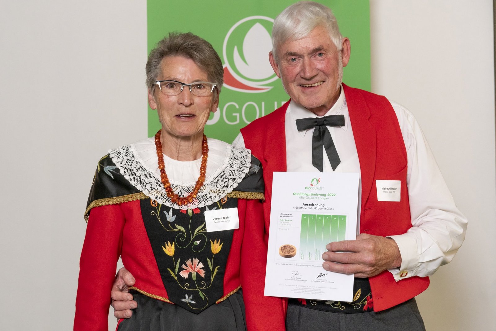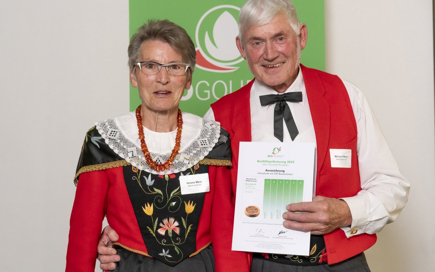 Das Aussehen der Nusstorte sei erfrischend anders, wird Brotsommelier Freddy Bau in einer Mitteilung von Bio Suisse zitiert, «wie eine Sonne im Abendlicht». Das Gebäck aus dem Bündnerland setzte sich im Wettbewerb der besten verarbeiteten Schweizer Knospe-Produkte gegen 48 Mitbewerber von 16 Hersteller(innen) durch. Ein perfektes Verhältnis der Füllung zum buttrig-mürben Teig und die gelungene Backfarbe überzeugte demnach nicht nur den Brotsommelier.