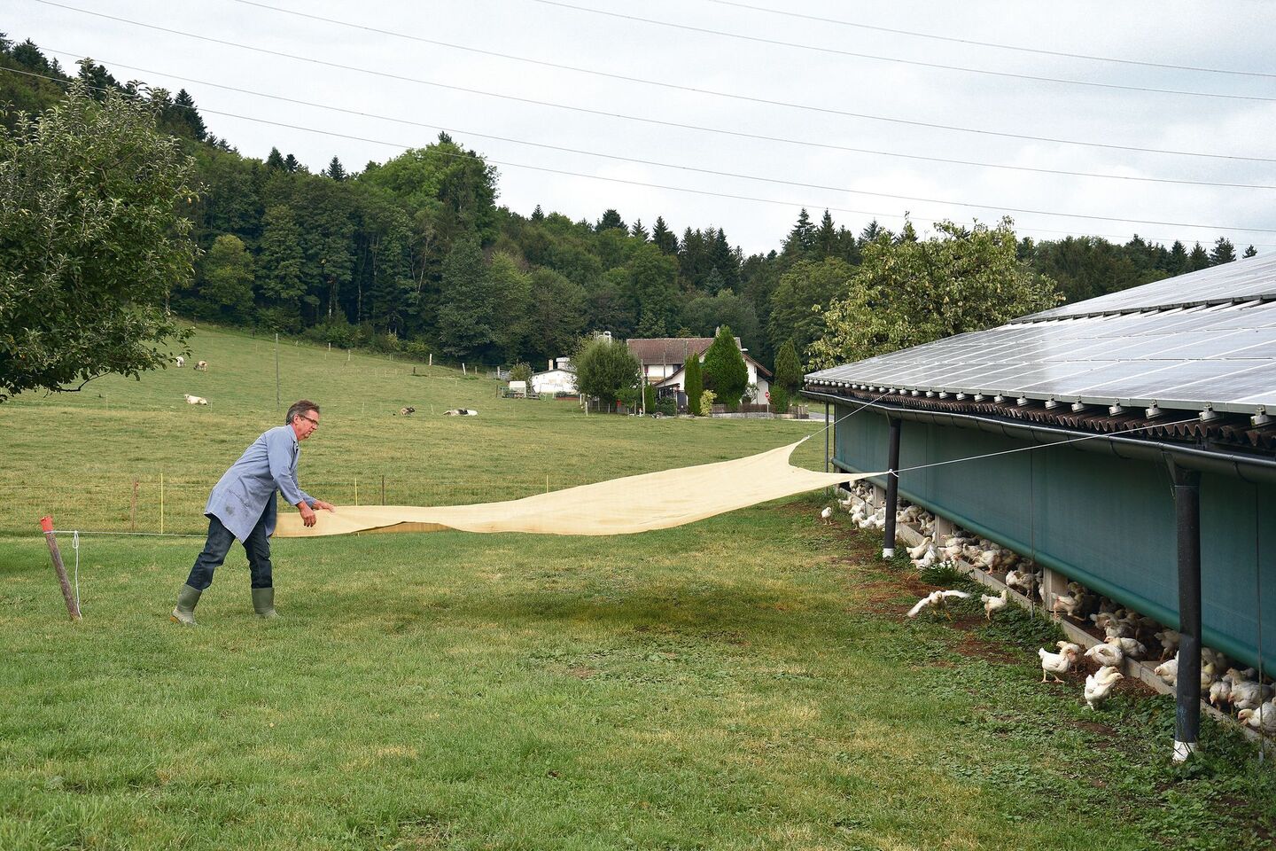 [REL 1]Mit dem Hochziehen des Vorhangs im Aussenklimabereich (AKB) öffnet Walter Stucki seinen Mastpoulets eine neue Welt: Zum ersten Mal dürfen sie nach draussen. Die Weide misst das Doppelte der Stallfläche und wird von Stuckis neustem Mitarbeiter – einem Mähroboter – in Schuss gehalten. Bäume und ein Dreieckstuch bieten Schatten und Deckung, aber so weit trauen sich die Hühner noch nicht. Schon vor 10 Jahren Für…