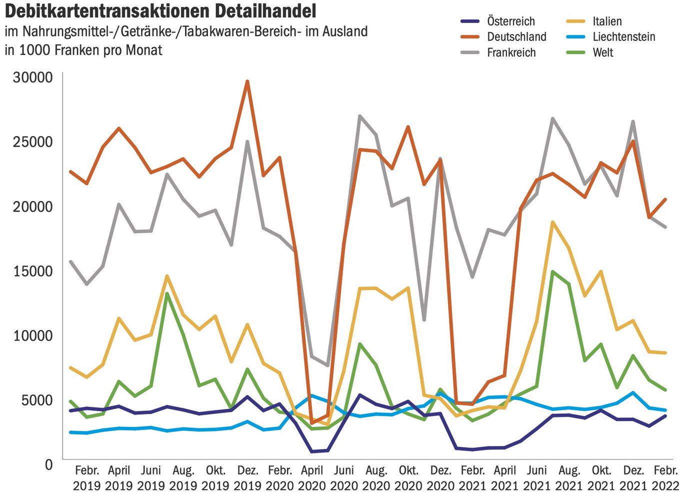 Der Blick auf die Lebensmitteleinkäufe, die per Kreditkarte im Ausland bezahlt wurden zeigt, wie viel Einkaufstourismus während der Coronazeit weggebrochen ist. Es zeigt aber auch, wie schnell die Konsumenten nach der Öffnung der Grenzen wieder ins billigere Ausland ausgewichen sind.