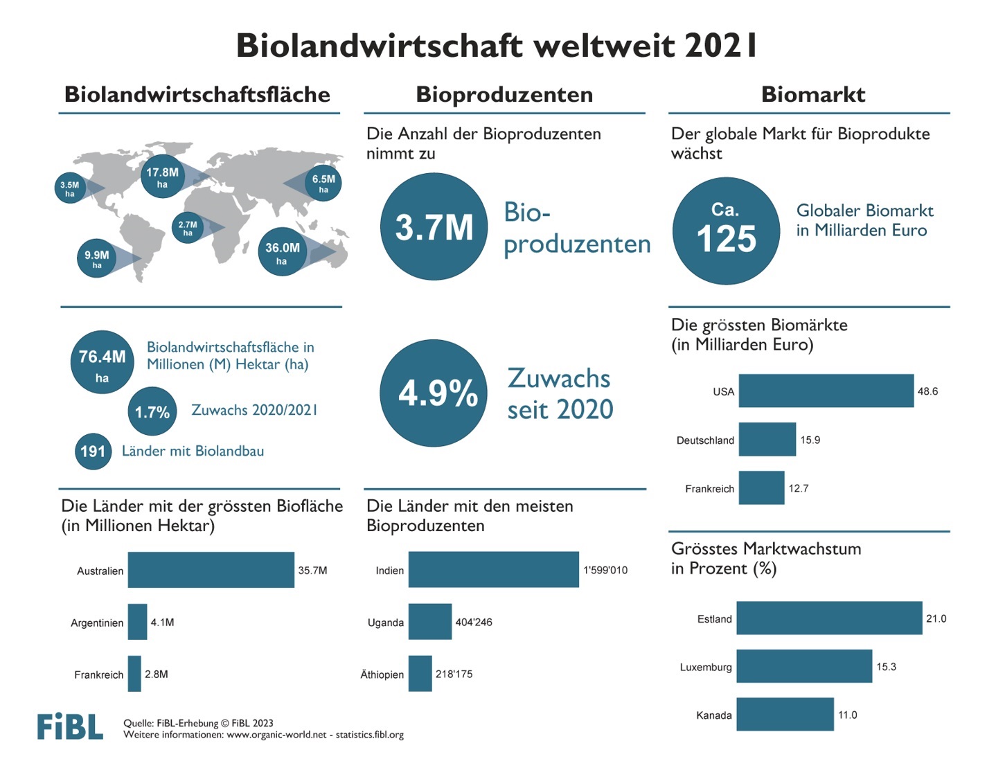 Im Jahr 2021 erreichte der weltweite Biomarkt laut FiBL einen Umsatz von fast 125 Milliarden Euro – ein Anstieg von fast 4 Milliarden Euro. Mit umgerechnet 48,6 Milliarden Euro waren die Vereinigten Staaten 2021 der weltweit führende Markt, gefolgt von Deutschland (15,9 Milliarden Euro) und Frankreich (12,7 Milliarden Euro).