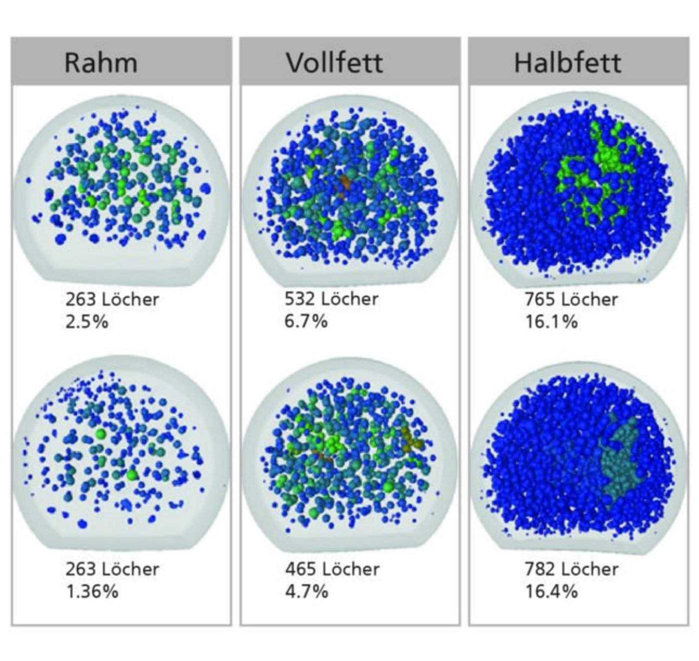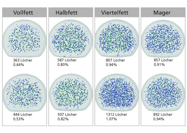 Auf der Rahmstufe stellten die Forschenden nicht viele Löcher fest. Die CO2-Bildung und dessen Löslichkeit im Fett halten sich hier die Waage, so die Erklärung.