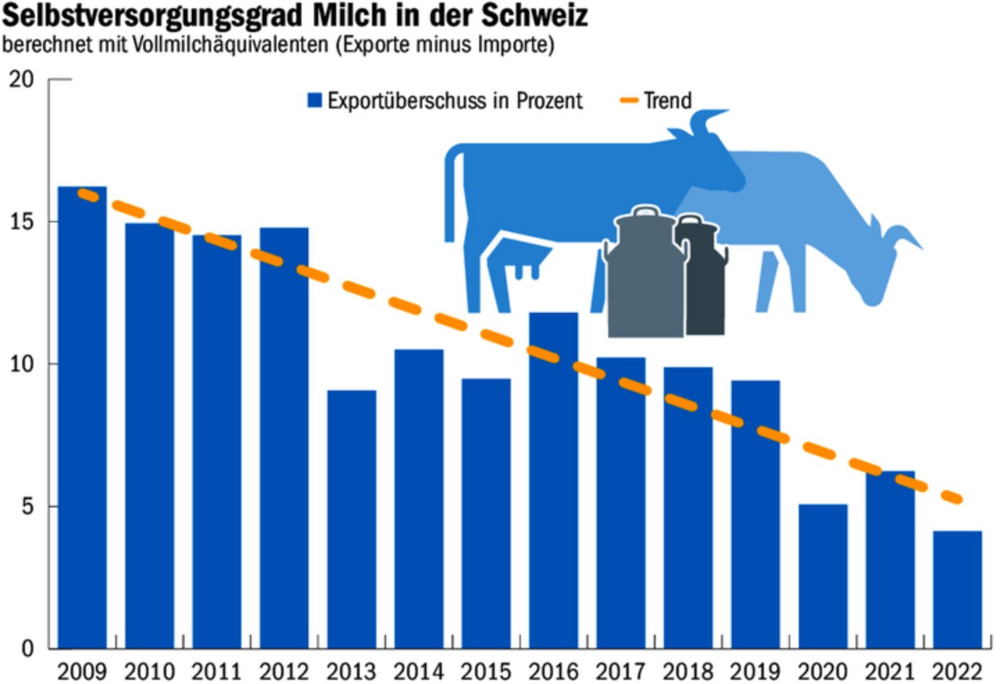 [REL 1]Der Selbstversorgungsgrad bei der Milch hat in den vergangenen Jahren abgenommen. Die Betrachtung erfolgt auf der Basis von Milchäquivalenten (VMA). Ein VMA entspricht 1 kg Kuh-Vollmilch. Dabei sind Verluste bei Verarbeitung (z. B. Schotte) und Handel berücksichtigt. Der Exportüberschuss betrug 2022 noch 4 % der im Inland vermarkteten Milchmenge. Für die weitere Entwicklung des Selbstversorgungsgrades sind…
