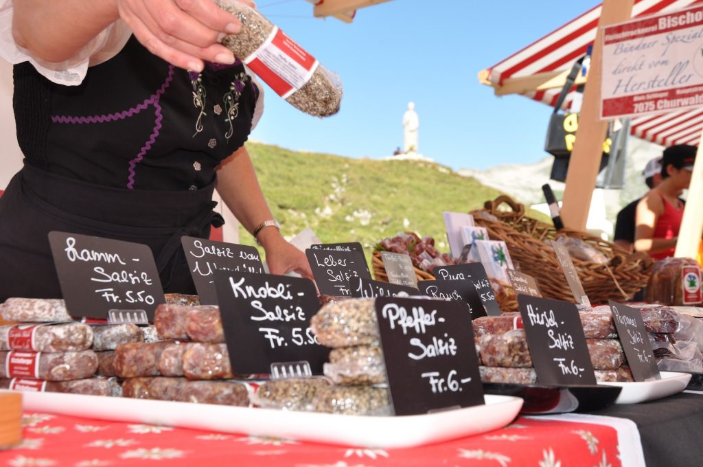 Das Marktangebot umfasst Kulinarisches und Handwerkliches aus den Kantonen Graubünden, Glarus, Uri und dem Tessin.