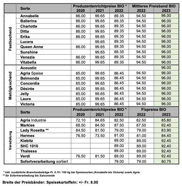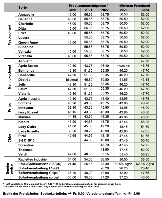Wie Swisspatat mitteilt, ist die Basis für die diesjährige Kartoffelernte gelegt. Nach den Diskussionen mit Vertreter(innen) aus Produktion, Handel und Verarbeitung steht laut der Branchenorganisation Folgendes fest: Speisesorten Das mittlere Preisband (MPB) wird bei allen Speisesorten gegenüber dem Vorjahr um Fr. 1.50/100 kg angehoben. Für alle festkochenden Speisesorten gilt neu das einheitliche MPB von Fr.…