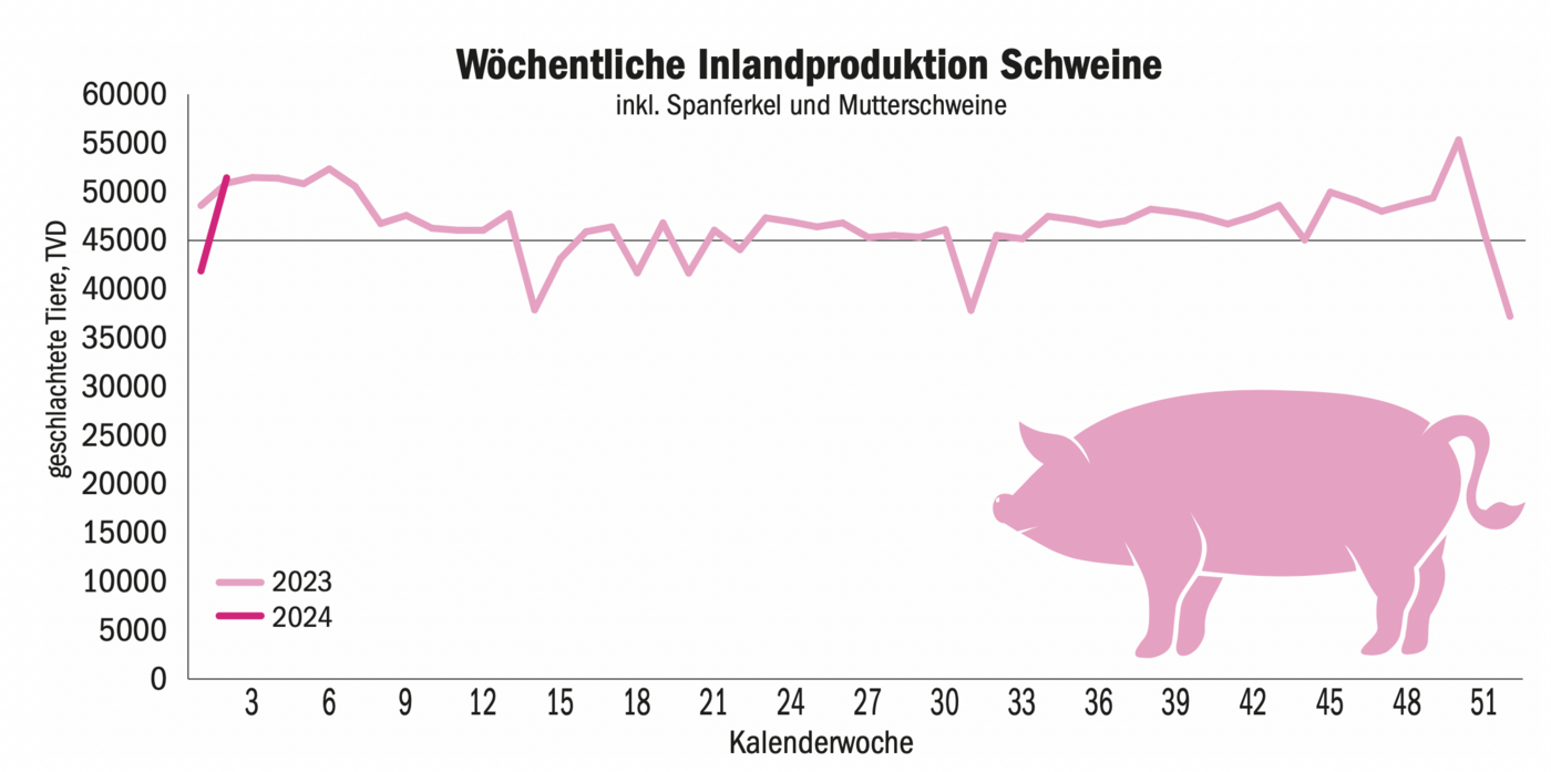 Seit 132 Wochen bekommen die Mastbetriebe für ihre Schlachtschweine Preise, die nicht kostendeckend sind. Die durchschnittlichen Schweinemastbetriebe bräuchten einen Schlachtschweinepreis von mindestens Fr. 4.40/kg SG, damit sie kostendeckend arbeiten können. Dieser Preis wurde seit mehr als zwei Jahren nicht mehr erreicht. In diesen Wochen sind die Schweineschlachtungen sehr hoch. Letzte Woche wurden 51 432…