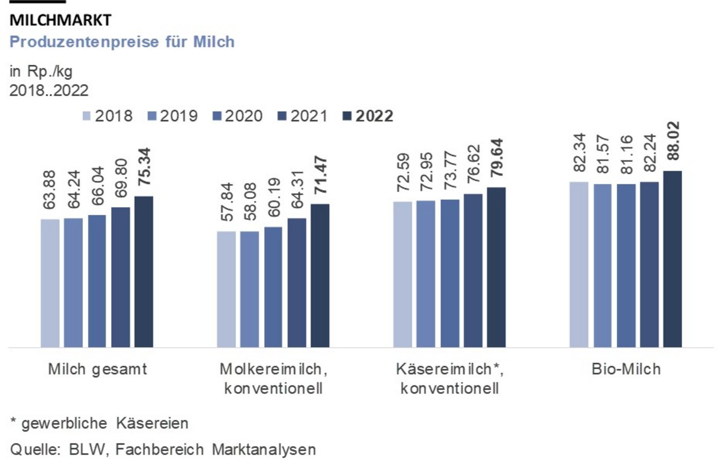 Seit 2017 habe der Produzentenpreis für Milch einen kontinuierlichen Zuwachs verzeichnet und habe 2022 schliesslich 75.34 Rp./kg erreicht, was 5.54 Rp./kg mehr sind als 2021. Mit einem Plus von 7,9 Prozent handle es sich um den stärksten Anstieg der letzten sechs Jahre.[IMG 2]