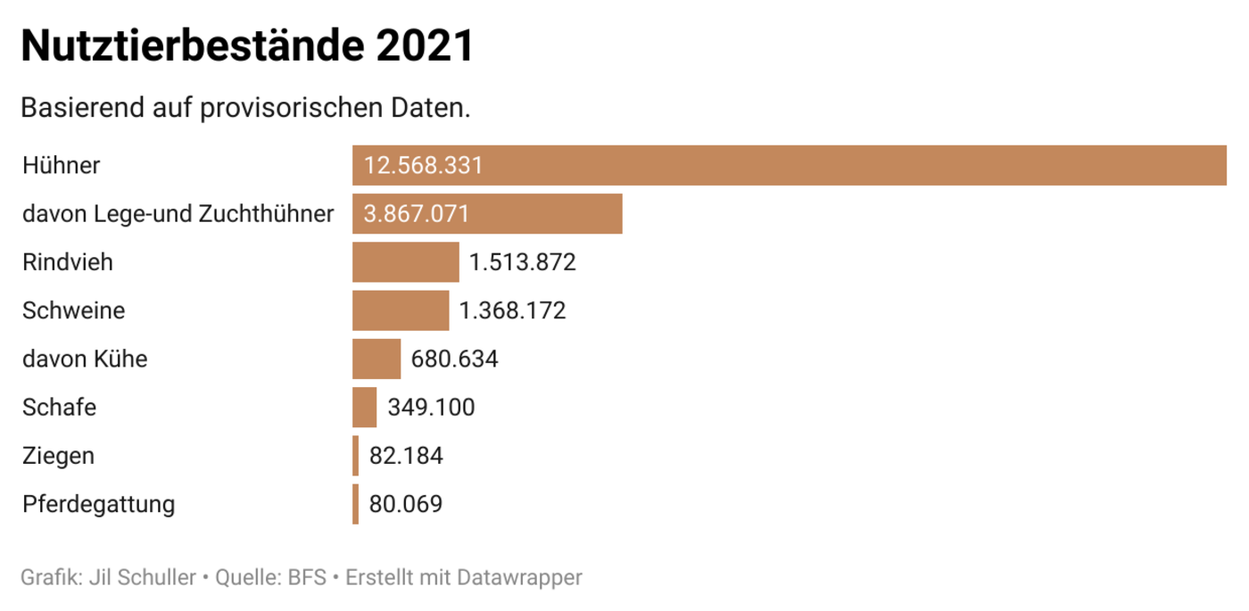 Ziegen scheinen sich steigender Beliebtheit zu erfreuen, jedenfalls nahm ihr Bestand in der Schweiz von 2020 bis 2021 um 2'622 Stück oder 3,3 Prozent zu. Ziegenprodukte, insbesondere Ziegenkäse, erwies sich in den letzten Jahren als Wachstumsmarkt. Ein Wachstum verzeichnet man auch bei der Gesamtzahl Schweine (+ 1,5 Prozent oder rund 19'900 Stück) und Schafe (+ 1,6 Prozent oder rund 5'600 Stück). Bei den Schweinen haben die guten Preise der vergangenen Jahre 2021 bei Jagern und Mastschweinen zu einem Überangebot geführt. Schaf- und Lammfleisch ist heute eine Nische, der aber grosses Potential zugesprochen wird. Mit 3'867'071 Tieren erreicht der Bestand an Legehe- und Zuchthühnern einen neuen Rekordwert. Seit Jahren floriert der Eiermarkt, es wird aber noch immer auch einiges importiert.
