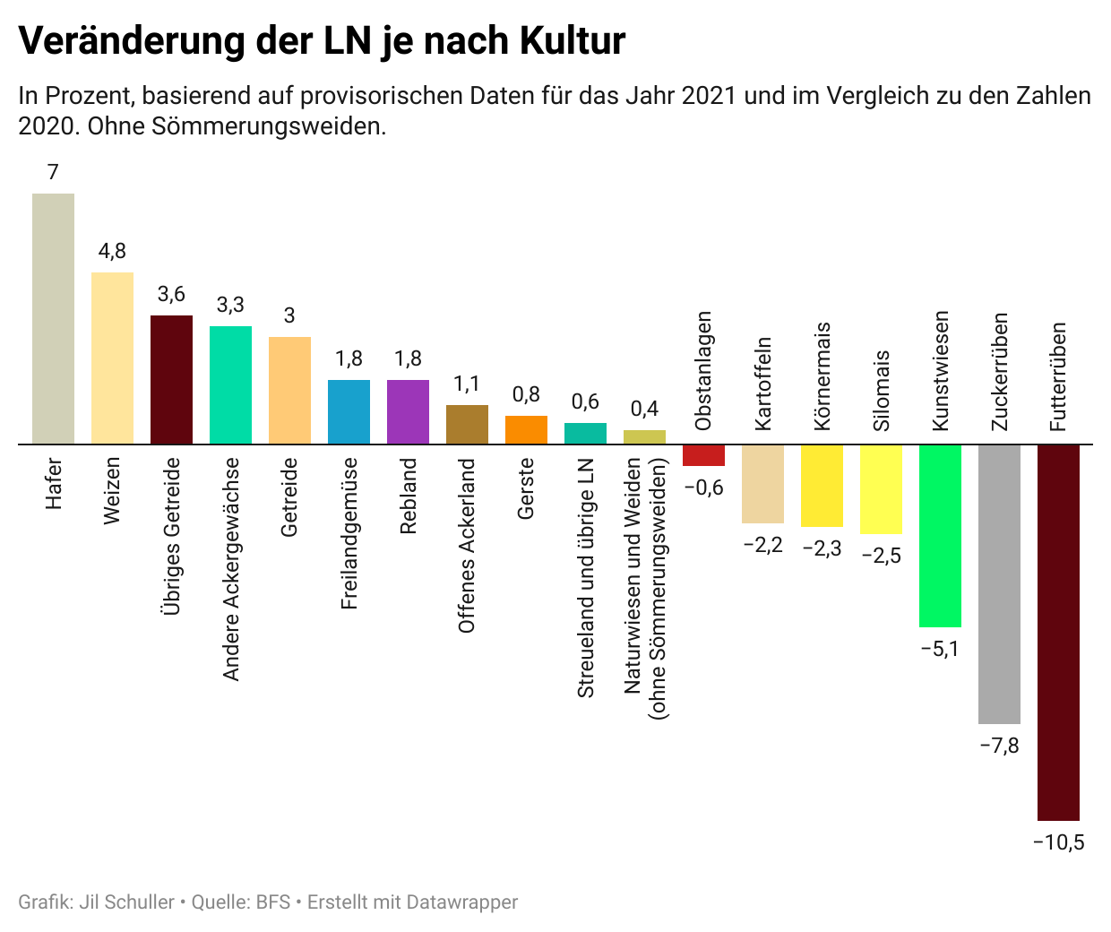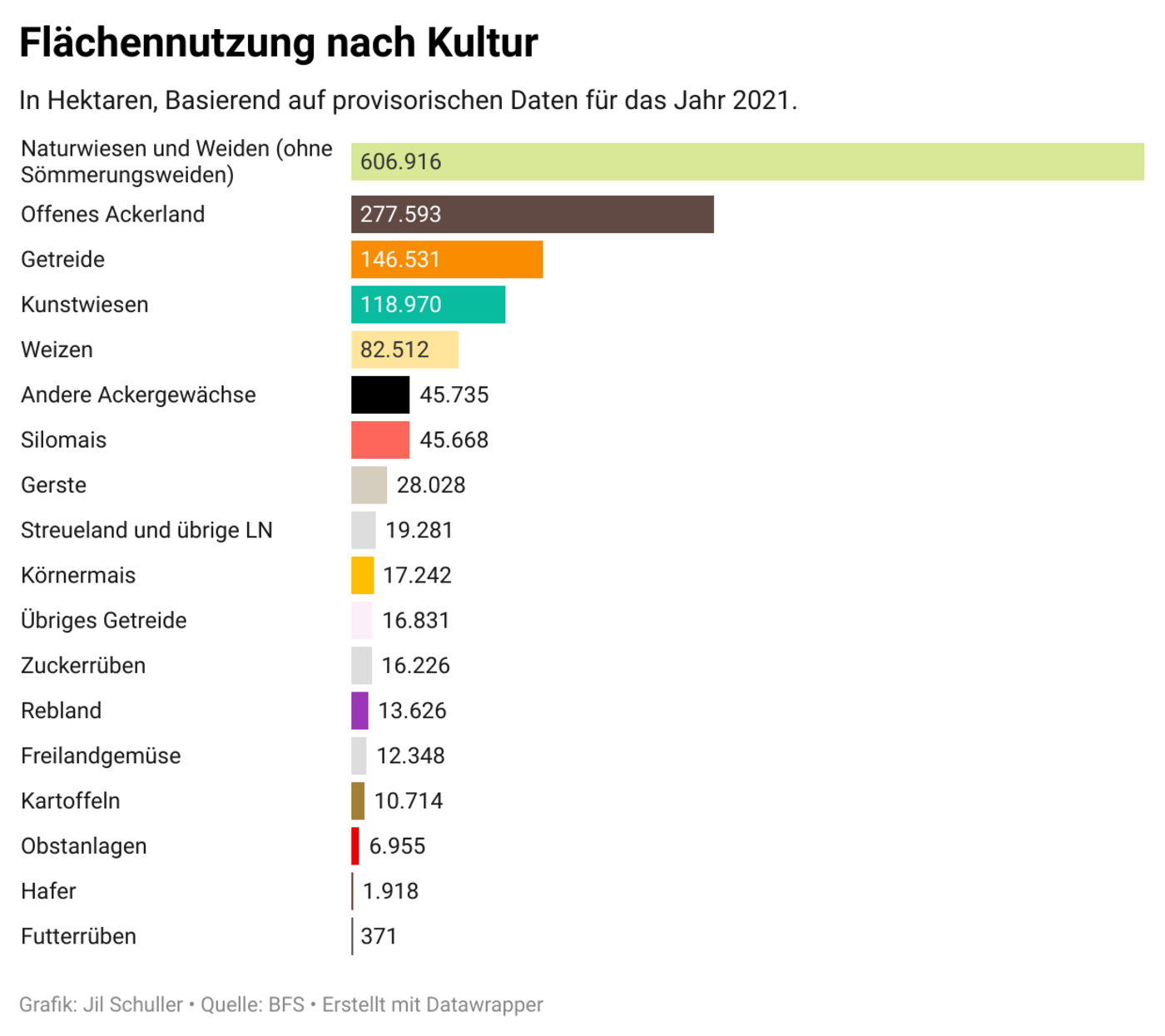 Den provisorischen Daten des Bundesamts für Statistik (BFS) zufolge beliefen sich die Landwirtschaftlichen Nutzflächen (NL) in der Schweiz 2021 gesamthaft auf 1'043’000 ha. Verglichen mit 2020 bedeutet das einen Rückgang um 0,1 Prozent oder knapp 700 ha.
