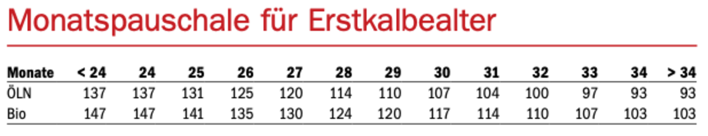 - Einmonatige Kälber aus Mutterkuhhaltung: Fr. 470.–, plus Fr. 100.– für jeden zusätzlichen Monat.