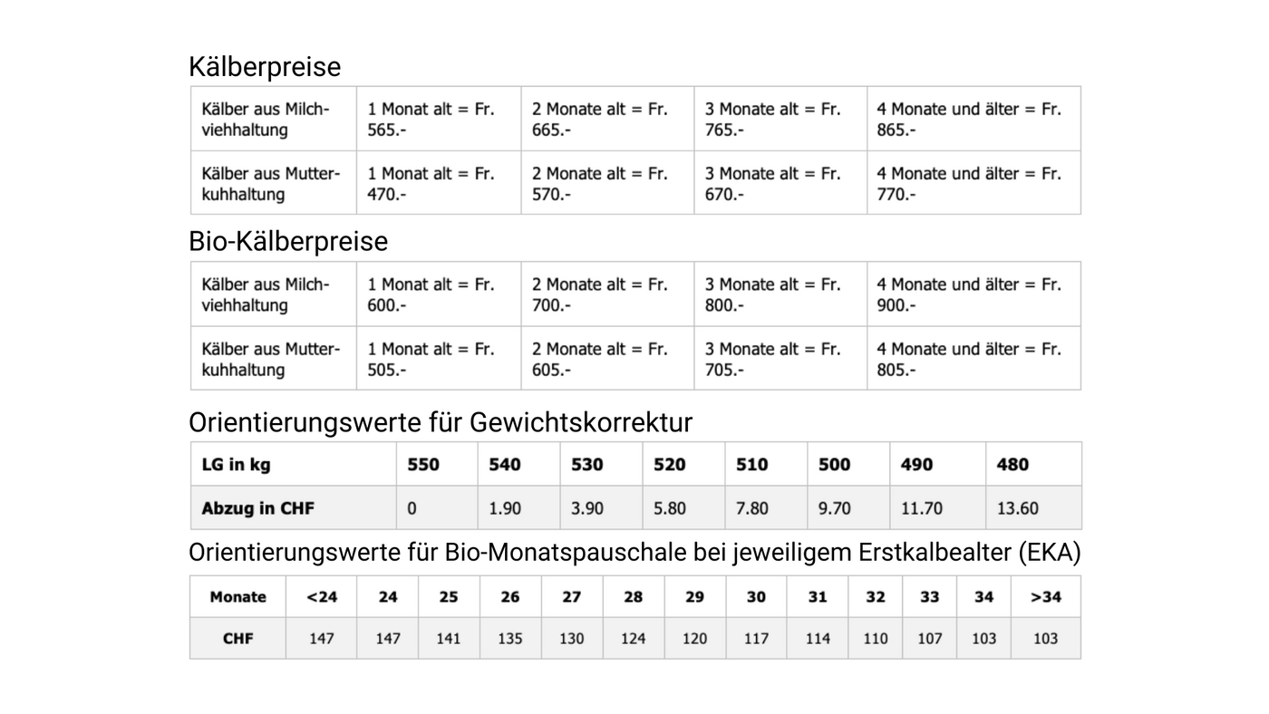 - Kälberpreis für einmonatige Vertragskälber aus Milchviehhaltung: Fr. 565.–, plus Fr. 100.– für jeden zusätzlichen Monat.