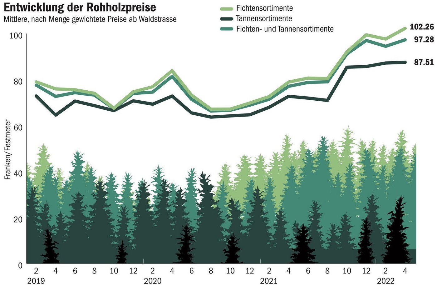 Entsprechend sind die Holzpreise an die Energiepreise gekoppelt. Auch in der Schweiz profitieren Waldbesitzer von gestiegenen Holzpreisen. Geschmälert wird die Preissteigerung allerdings durch die gestiegenen Kosten für den Holzschlag, durch teureren Diesel und Ersatzteile. Etwas anders ist der Trend beim Bauholz. Hier sorgen die Inflation und die steigenden Hypozinsen auf dem Weltmarkt für Nervosität und sinkende Preise. Demgegenüber stehen jedoch weiterhin fehlende Exporte aus Russland sowie gestörte Lieferketten. Den grossen Preissturz müssen wohl die Waldbesitzer nicht fürchten.