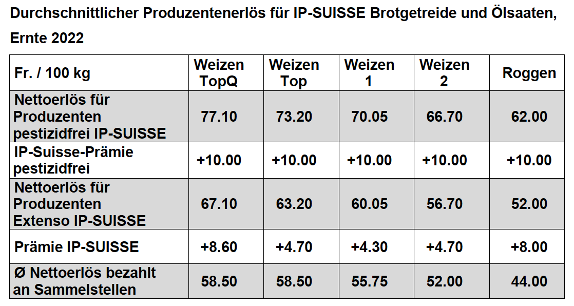 Bei der Vermarkung konnte der gestiegene Richtpreis etabliert werden. Der durchschnittliche Abrechnungspreis für IPS Weizen Top und der Klasse 1 bewegt sich auf dem Niveau von Fr. 58.50.-/dt und Fr. 55.75.-/dt. Somit wurde der Richtpreis beim IPS Weizen Top erreicht und bei der Klasse 1 gar übertroffen. Für die Klasse 2 konnte der Richtpreis mit Fr. 52.00.-/dt nicht ganz erreicht werden. Inklusive der Prämie für IP-Suisse Weizen und der zusätzlichen Prämie für Pestizdfrei konnte beispielweise für Weizen TopQ (Piz Nair, Runal, Titlis) ein Produzentenpreis von bis zu Fr. 77.10.-/dt erreicht werden.