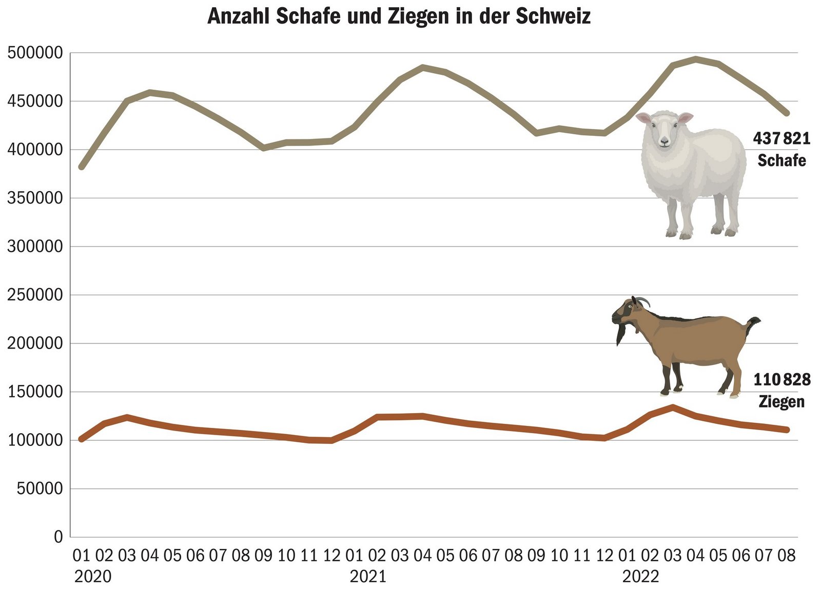 Zwar sind die Geburten bei Schafen und Ziegen stark saisonal und dadurch die Tierbestände über das Jahr stark schwankend. Betrachtet man das ganze Jahr, dann lebten im 2020 durchschnittlich 408'820 Schafe in der Schweiz, ein Jahr später waren es 417'195. Ende August dieses Jahr waren es 437'821 Schafe, wobei dieser Bestand bis Ende Jahr noch sinken wird.