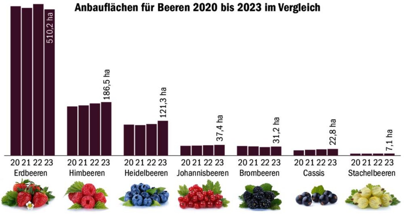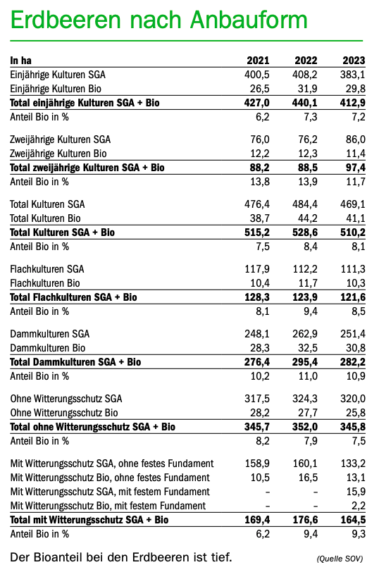 Bei den Erdbeeren ist ein Flächenrückgang von 3,5 % zu verzeichnen. Es sei bei dieser Kultur normal, dass die Anbaufläche jährlich schwanke, erklärt der SOV auf Nachfrage. Tatsache sei aber, dass es für einige Produzenten immer schwieriger werde, die Produktionskosten zu decken, so dass einige in der Folge den Anbau einstellen. Währenddessen nehmen jedoch beispielsweise bei Himbeeren, Brombeeren und Heidelbeeren die Flächen zu.
