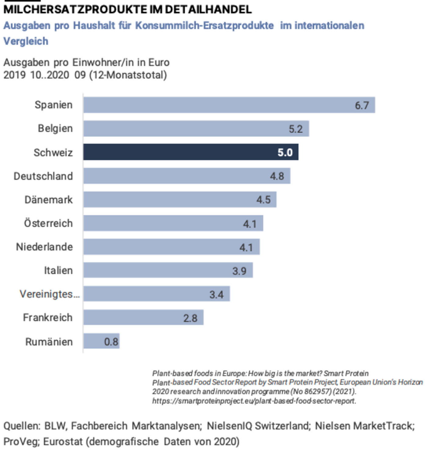 Nicht nur in der Schweiz erlebt Milchähnliches aus Pflanzen einen Boom, in der Regel angeführt vom Haferdrink. Im internationalen Vergleich liegt die Schweiz bei den jährlichen Ausgaben pro Kopf für diese Produkte auf Platz drei, Spanien und Belgien führen die Liste an. Als grösster Markt in dieser Hinsicht gilt Deutschland.