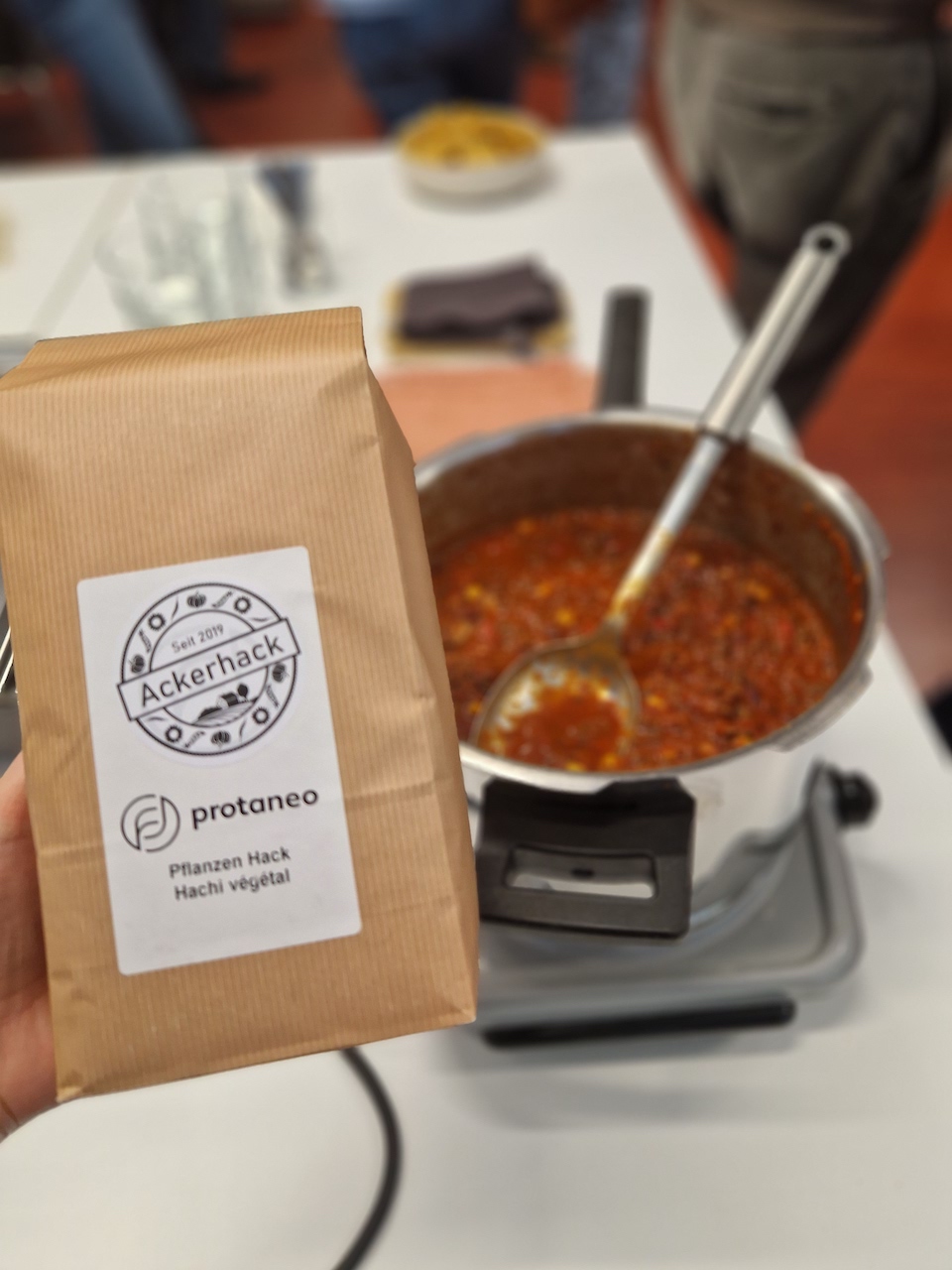 Mittlerweile gibt es von Protaneo-Pflanzenhack auf Basis einheimischer Erbsen und Ackerbohnen sowie Presskuchen aus der Herstellung von Pflanzenöl. Letztere Zutat mache annähernd die Hälfte der verwendeten Rohstoffe aus, so Koller. Er selbst stammt aus einer Bauernfamilie und die war angesichts des getrockneten, veganen Hacks skeptisch. Das änderte sich, als die «Ackerlasagne» beim gemeinsamen Weihnachtsessen sogar die Kinder als ausgesprochene Karnivoren überzeugte. «In Zukunft wollen wir damit in die Systemgastronomie», erläuterte der Unternehmer. Bereits sei Protaneo erfolgreich in SAC-Hütten. Dort schätze man den Vorteil der langen Haltbarkeit ohne Kühlung und dass das Pflanzenhack weder Gluten noch Soja als Allergene enthält.[IMG 5]