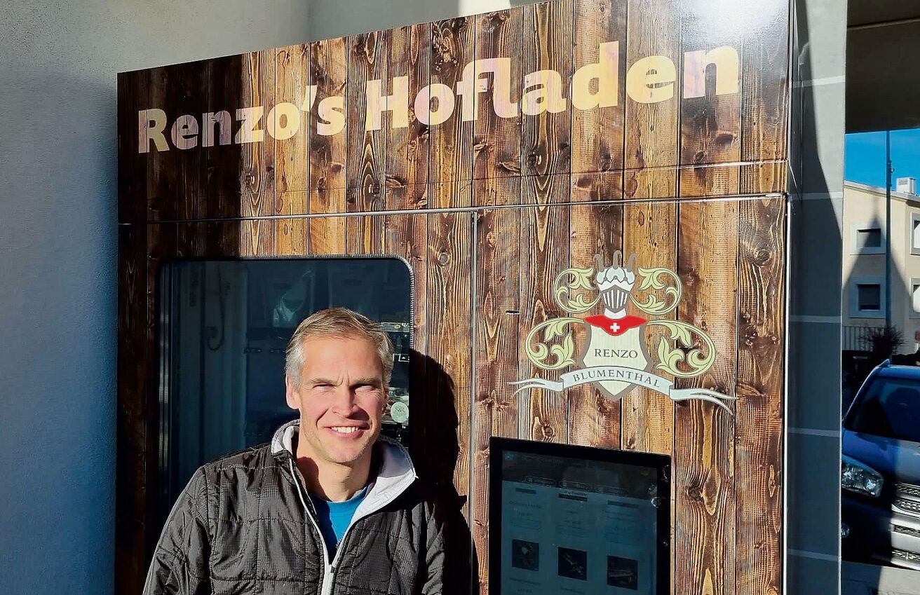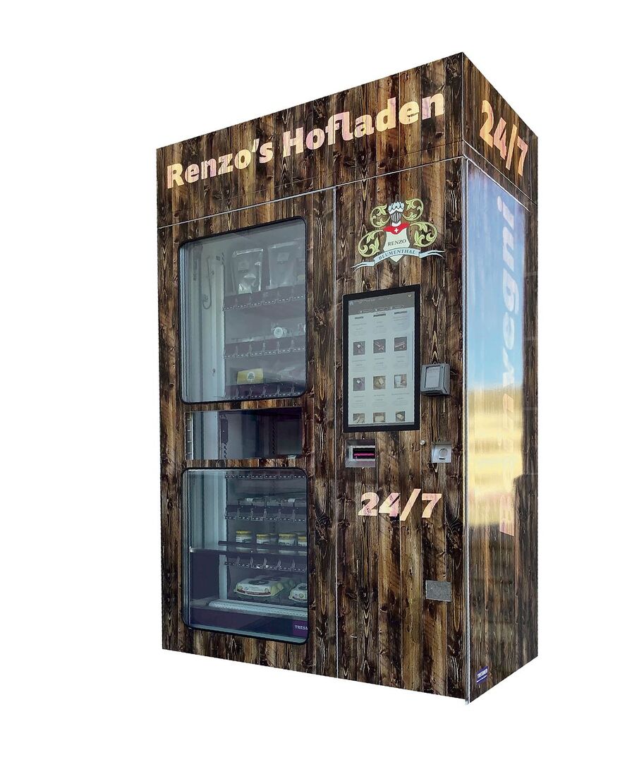 Das Elternhaus von Renzo Blumenthal steht mitten im Dorf Vella, direkt an der Hauptstrasse. Ein guter Standort, und so hat der Landwirt seinen Automaten dort neben dem Hauseingang platziert. Auf dem mit Holz verkleideten Automaten steht vorne in grossen Buchstaben «Renzo’s Hofladen 24/7».[REL 1] Auf der Seite steht «Beinvegni 24/7» – das ist romanisch und heisst: Willkommen 24/7. Der Automat ist etwas höher als die…