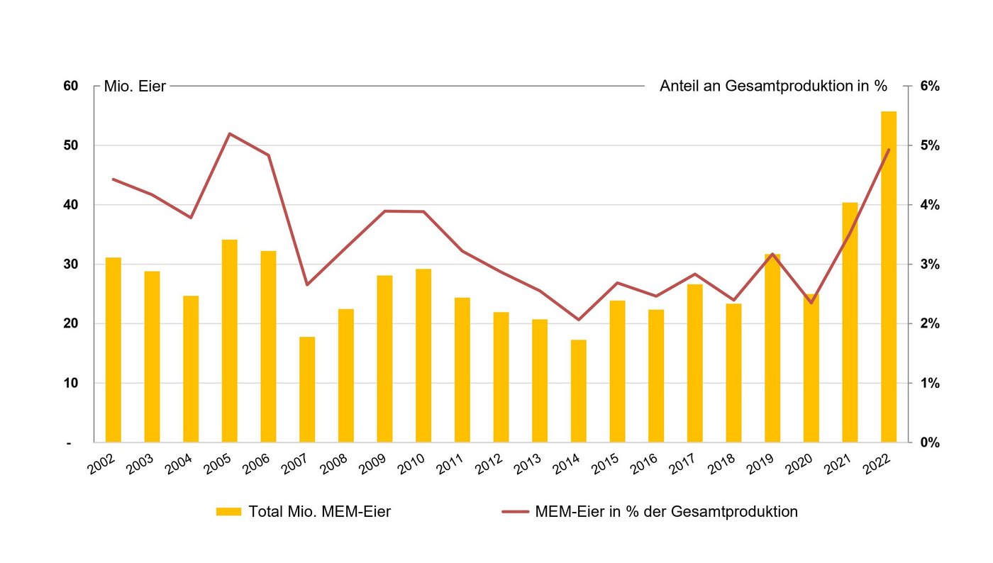 Mittel- und längerfristig steigerten die Produzenten die Zahl der Legehennen aber und bauten die Produktion aus, um die überdurchschnittlich hohe Nachfrage zu befriedigen. Seit dem Ende der Pandemie verkauft der Detailhandel aber deutlich weniger Eier und seitdem eilt die zuvor erhöhte Produktion der Nachfrage voraus. Um die Lager abzubauen, werden überschüssige Eier aufgeschlagen und zu Eiprodukten verarbeitet sowie weniger Verarbeitungseier importiert. Ausserdem versuchen die Eivermarkter mit längeren Leerzeiten, einer Reduktion der Tierzahl im Stall bis hin zu Vertragskündigungen auf die Überproduktion und die angespannte Marktlage zu reagieren.