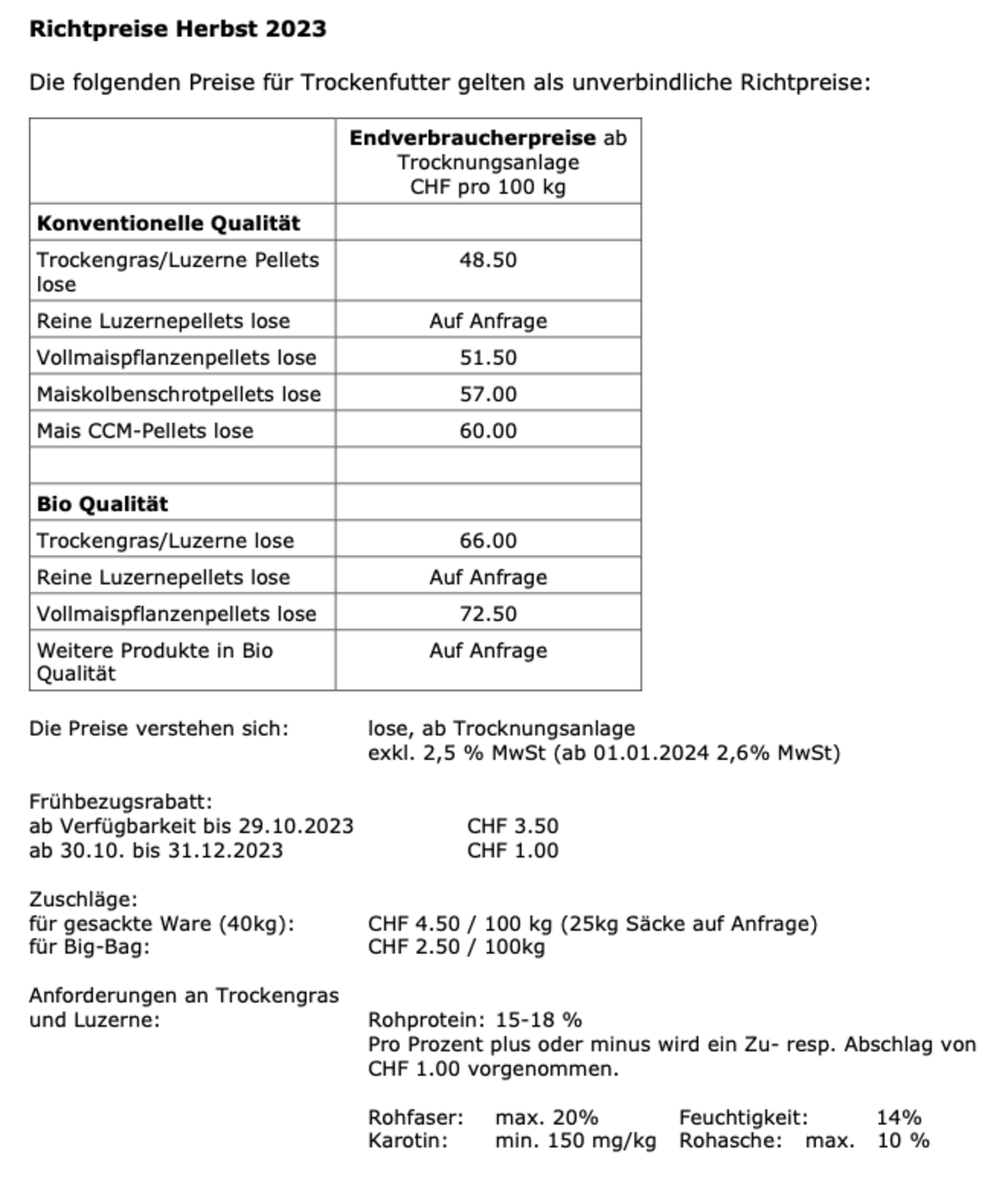 Den Entscheid, die Richtpreise auf demselben Niveau zu belassen, haben Vertreter des Verbands Schweizerischer Trocknungsbetriebe, vom Schweizerischen Raufutterverband, Bio Suisse und der Handel zusammen gefällt. Gleich bleiben laut Mitteilung die Richtpreise für