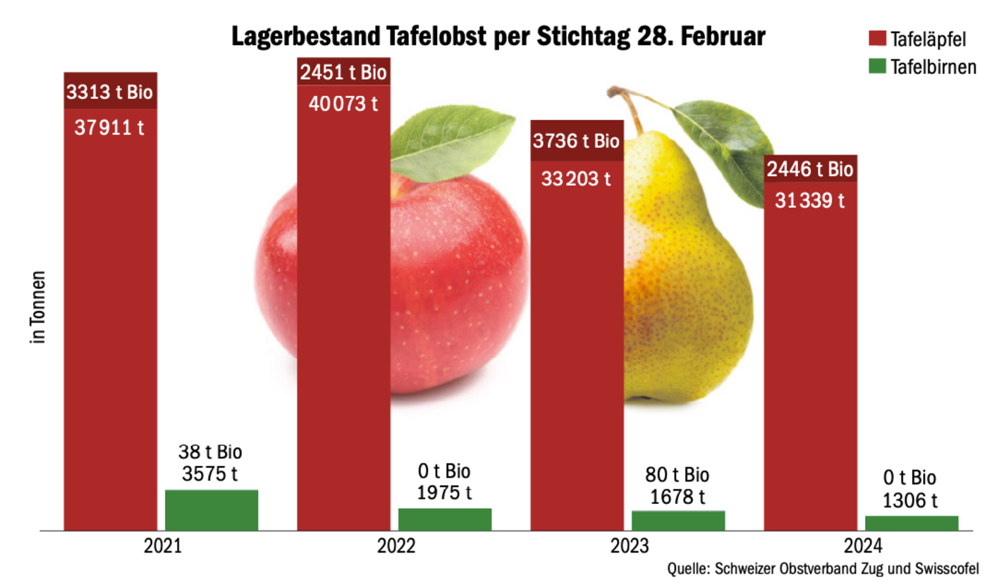 Zwar sind die Lagerbestände sowohl bei Äpfeln wie auch bei Birnen tief, es werden aber auch deutlich weniger einheimische Äpfel gegessen als in den vergangenen Jahren. Die Lagerminderung im Februar liegt mit total 7192 t um 890 t tiefer als im vergangenen Jahr. Der Vierjahresdurchschnitt der Lagerminderung liegt bei 7454 t. Keine Biobirnen mehr Bei den Tafelbirnen liegt der Lagerbestand im Februar mit 1306 t um 372…