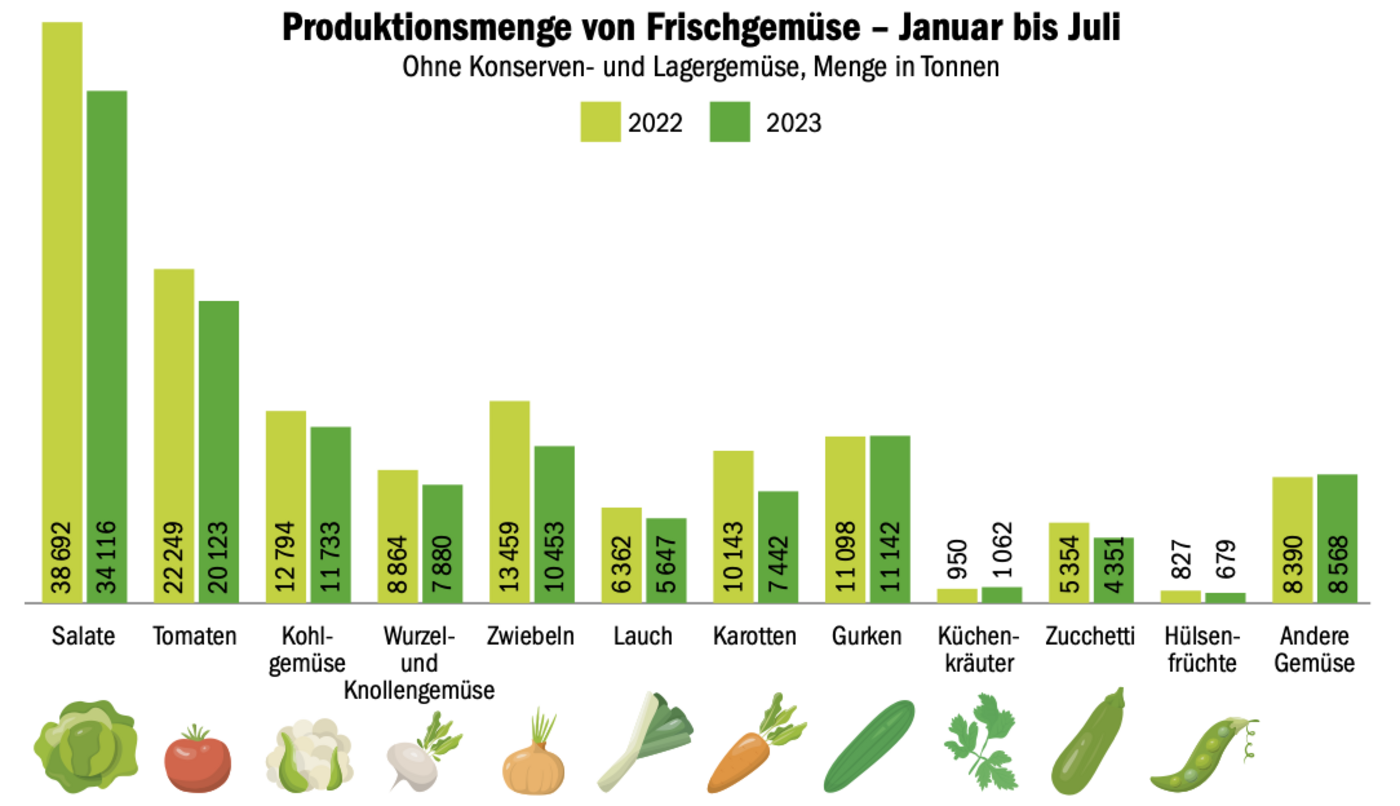 Ein nasser und kühler Frühling sorgte beim Gemüsebaujahr für einen verhaltenen Start. Im Vergleich mit dem Vorjahr wurden von Januar bis Juli 15'988 Tonnen weniger Gemüse geerntet als im Vorjahr, das zeigt die Auswertung der Schweizerischen Zentralstelle für Gemüsebau und Spezialkulturen.
