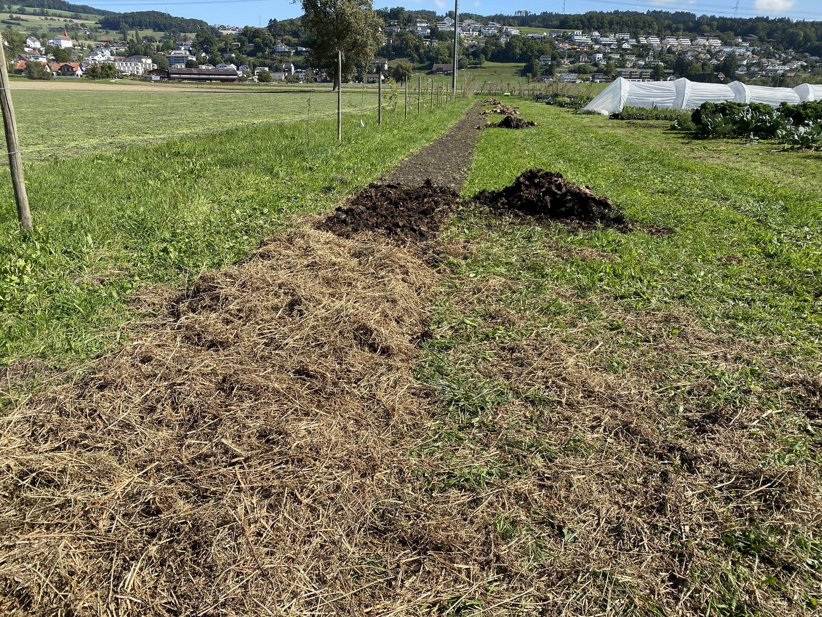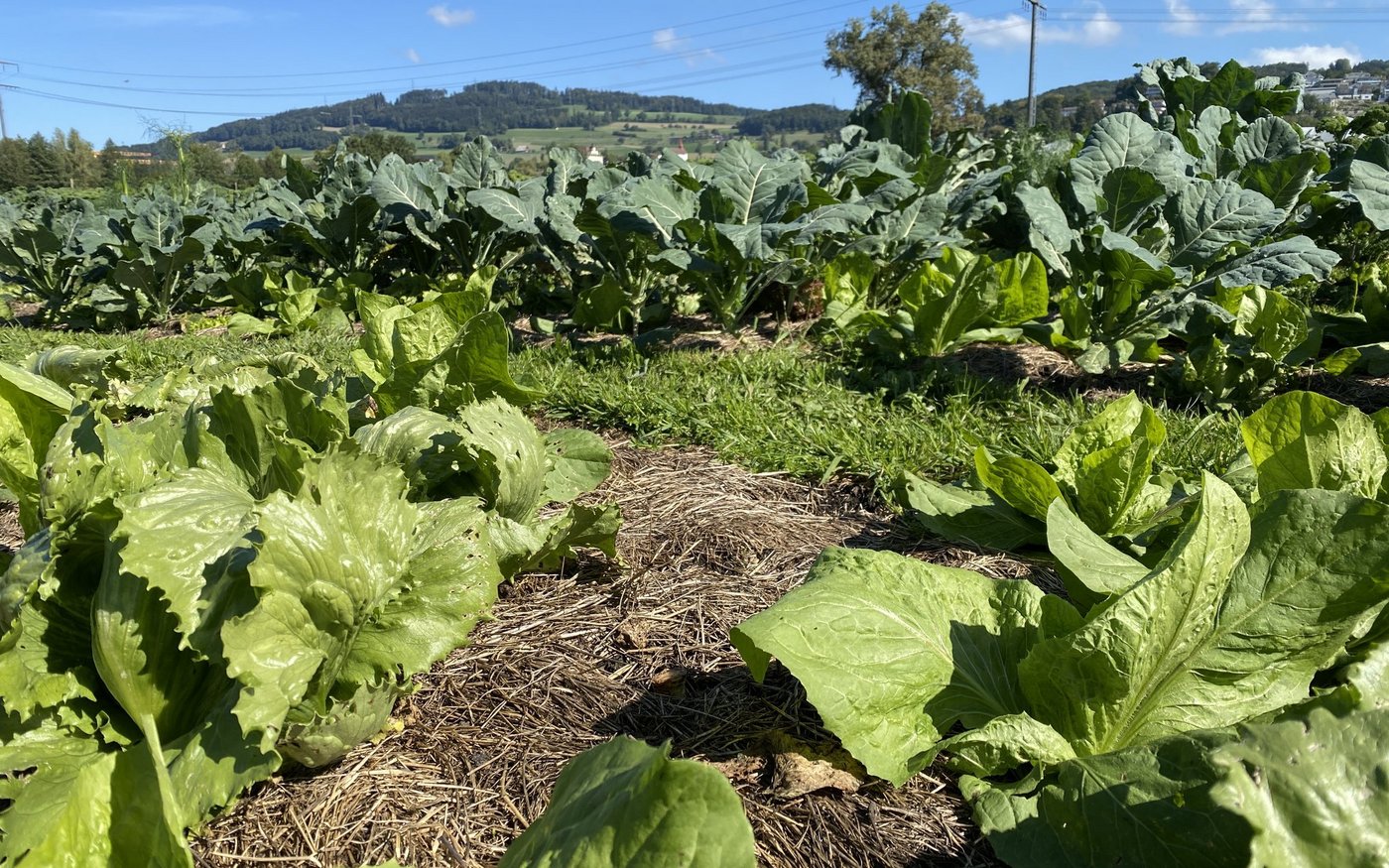 Im Tunnel wächst das Gemüse mit Mist als Dünger und einer dicken Mulchschicht aus Stroh, draussen bedeckt Ökoheu die Beete. Der Boden wird nicht bearbeitet, Humusaufbau ist das Ziel. «Im Freiland zersetzt sich der Mulch viel schneller als drinnen mit der Tröpfchenbewässerung. Nach etwa drei Sätzen Salat mulchen wir von Hand nach.» Noch erfolgt das Setzen mit einem Akkubohrer, der ein Loch in Mulch und Boden bohrt. Künftig wollen die Luzerner eine selbst konstruierte Maschine dafür einsetzten. «Es ist uns wichtig, dass wir diese Handarbeit durch effiziente Maschinen ersetzen kann», sagt Dario Heller. Das Ziel ist eine weitere Steigerung der Arbeitseffizienz.