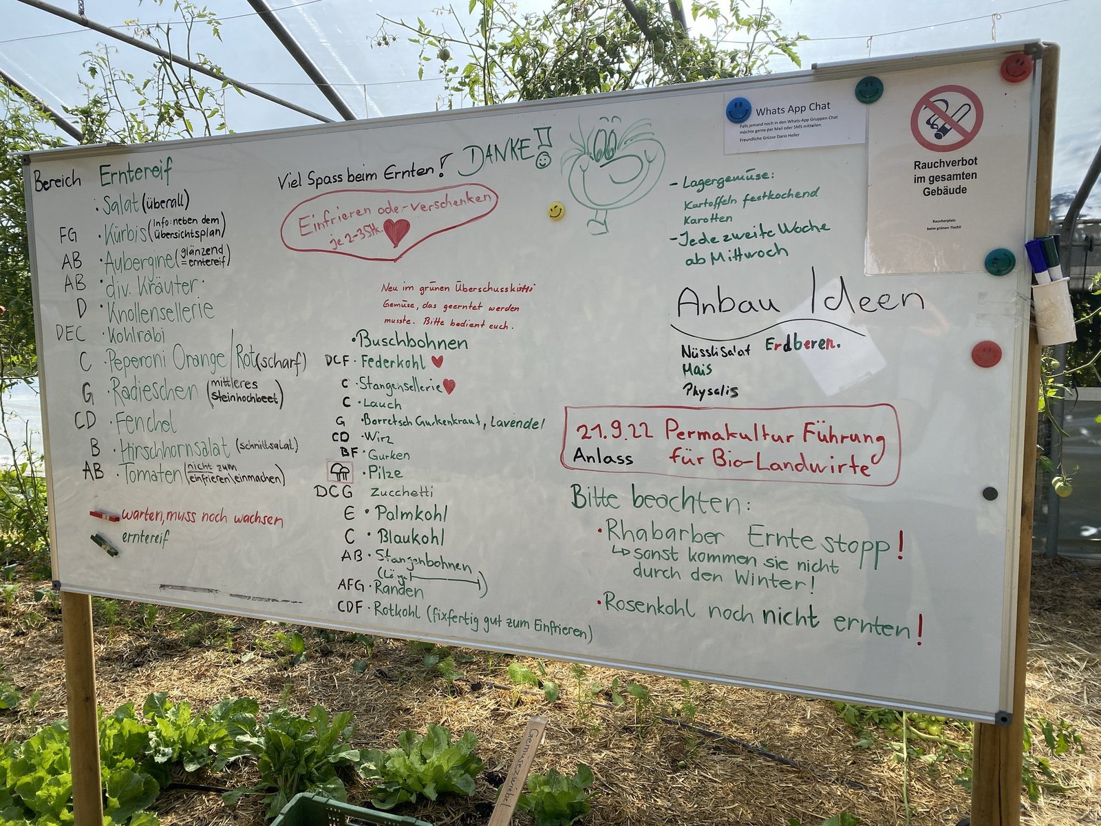 Mit der Betreuung ihrer Abo-Kunden haben die beiden Betriebsleiter wenig zu tun. Eine grosse Tafel im Gewächshaus informiert darüber, was wo zu finden und was erntereif ist. Via Tafel werden Anbauideen für die nächste Saison gesammelt, so haben die Abonnenten auch die Möglichkeit zur Mitbestimmung. «Über eine Umfrage stellen wir dann fest, ob das Interesse gross genug ist und wovon wir als Kompensation weniger anbauen können», erläutert Dario Heller das Vorgehen.