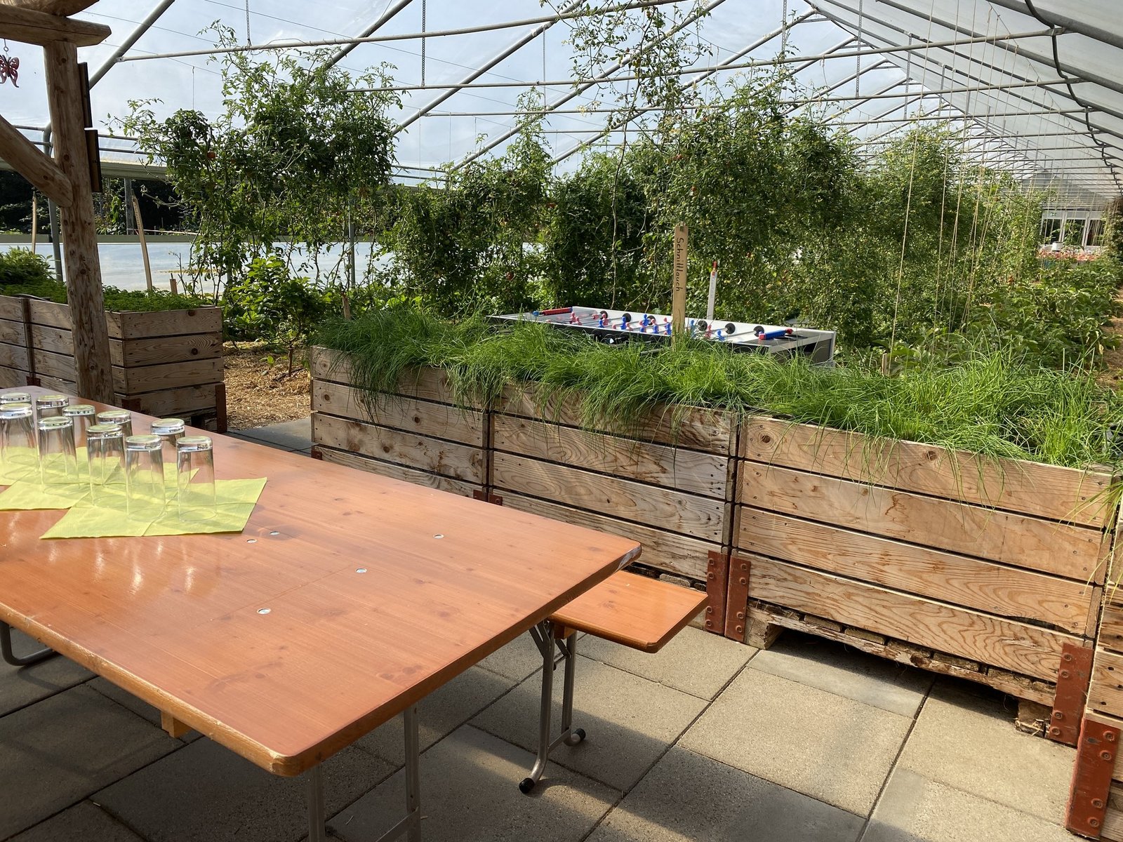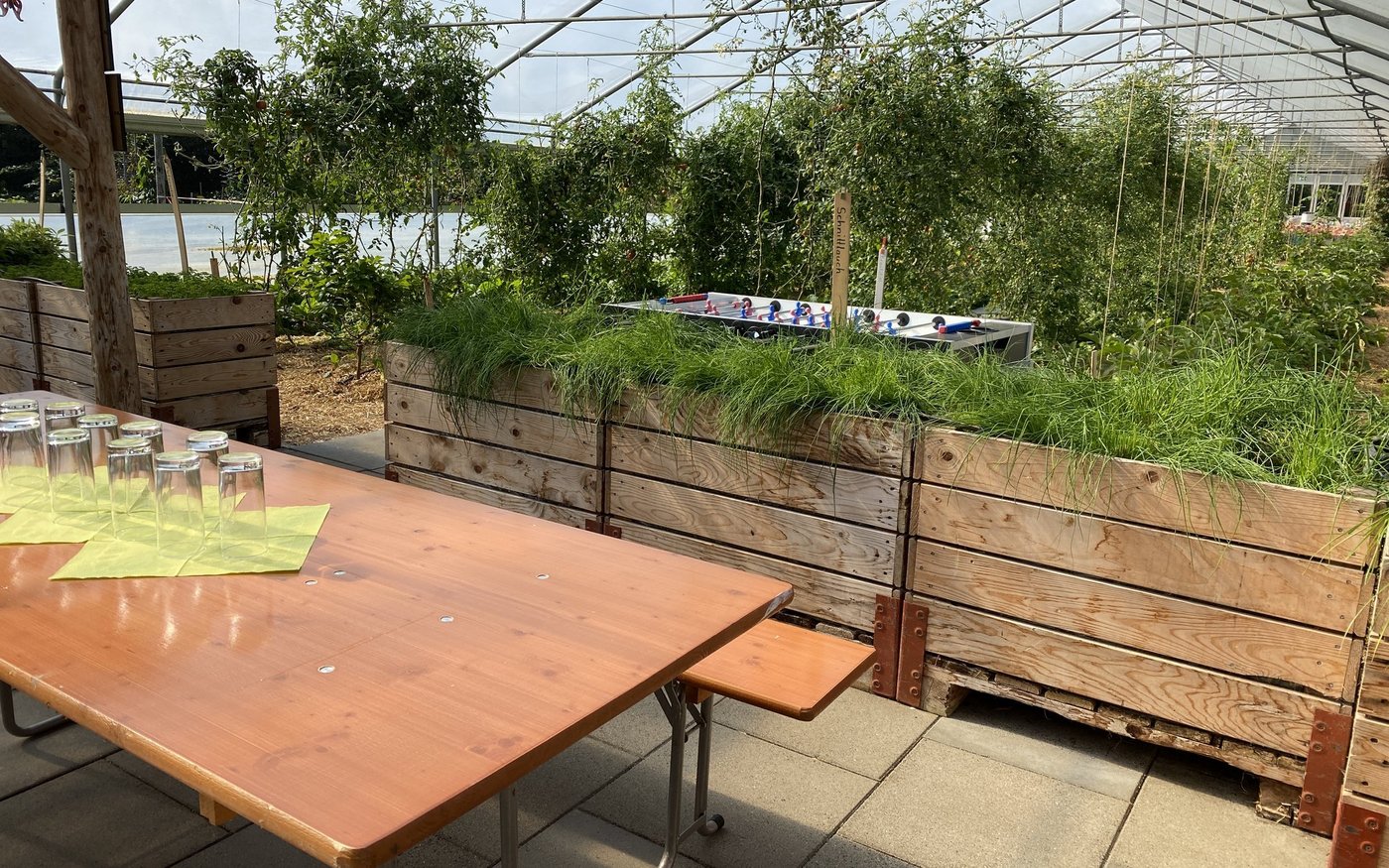 Familie Heller bietet ihren Abonnenten die Möglichkeit auch eigene Projekte zu realisieren. Dies unter der Voraussetzung, dass sie selbst die Verantwortung übernehmen und am Ende alle davon profitieren können. So hat eine 8-köpfige Gruppe in einer feuchten Ecke der von Hecken als Windschutz umstandenen Fläche eine Pilzzucht eingerichtet. «Wir haben Material, das wir gerade zur Hand hatten und das Flüssigmyzel zur Verfügung gestellt», erzählt der Junglandwirt. Tatsächlich konnten einige Edelpilze geerntet werden und der runde Platz mit den grossen Holzkästen wirkt sorgfältig gestaltet und aufgebaut. «Damit schaffen wir auch eine Bindung zu der Fläche», ist Dario Heller überzeugt. Das Gewächshaus selbst wurde zu einem gemütlichen Treffpunkt: Zwischen Tomaten, Peperoni und Kräutern befindet sich ein Aufenthaltsraum mit Holztischen und einem Töggelitisch.