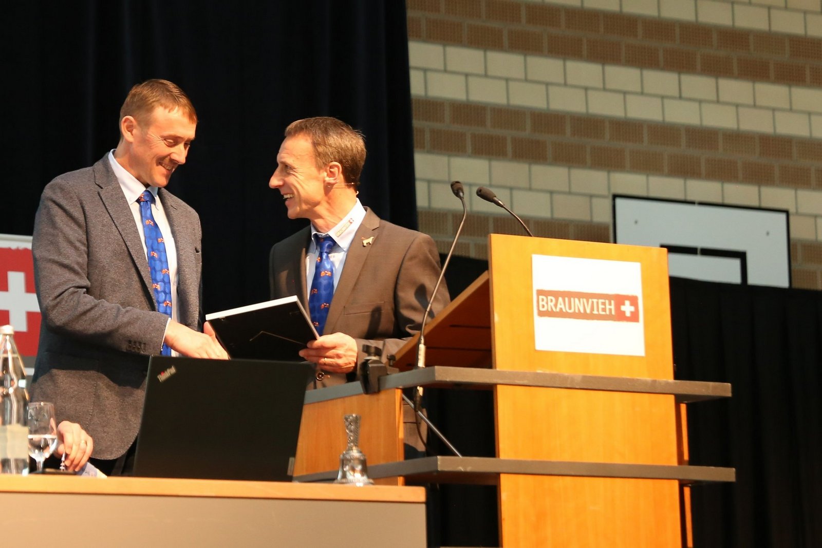 Eine erfreuliche Aufgabe hatte Vizedirektor Andreas Kocher: Er durfte die Besitzer von 50 Braunviehkühen für ihre langlebigen Tiere ausgezeichnet. Geehrt wurde auch der abtretende Verbandspräsidenten Reto Grünenfelder, der von den Delegierten zum Ehrenpräsidenten gewählt wurde.