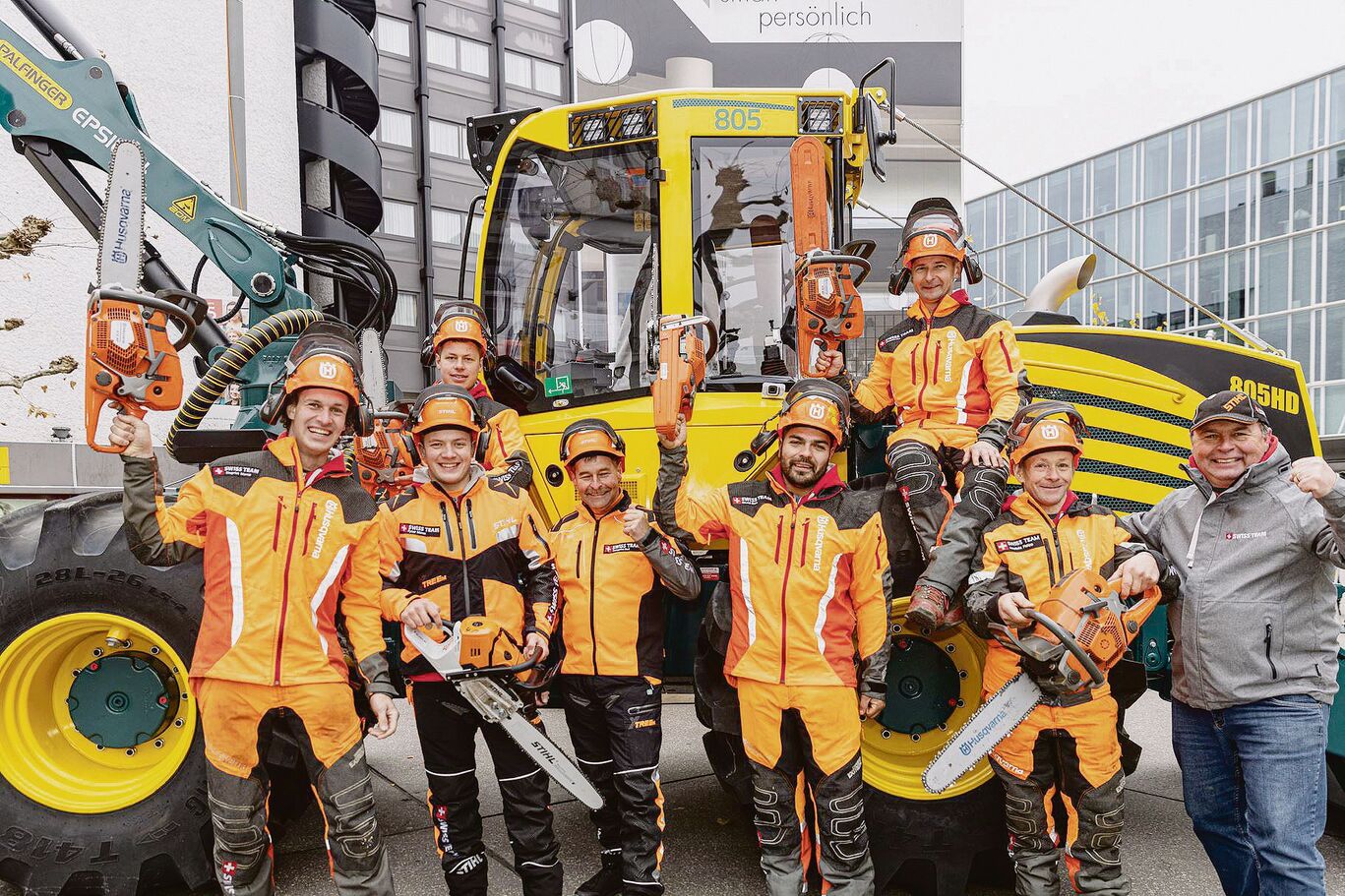 Sie traten in zwei Dreierteams gegeneinander an. Kettenwechsel, 30 Äste entlang einer sechs Meter langen Stange absägen, nochmals ein Kettenwechsel und das in sagenhaften 36 Sekunden. Das beeindruckte das Publikum. Die besten Holzhauer wechseln eine Kette in weniger als zehn Sekunden.