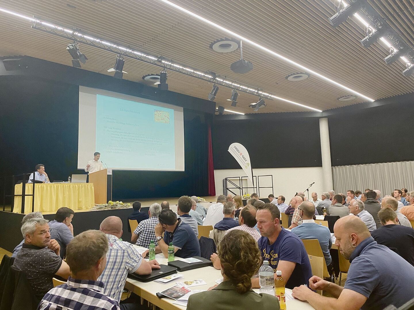 «Nebst dem WEF die zweitwichtigste Veranstaltung am heutigen Tag.» RuediFischer, Präsident der Vereinigung Schweizerischer Kartoffelproduzenten (VSKP), läutet die 50. Mitgliederversammlung mit einem Scherz ein. «Schön, schwierig, schlimm – die drei S treten im Laufe eines Jahres immer wieder auf», Ruedi Fischer geht auf jedes «S» kurz ein. «Schön ist, wenn ich euch hier begrüssen und die aktuellen Kartoffelbilder…