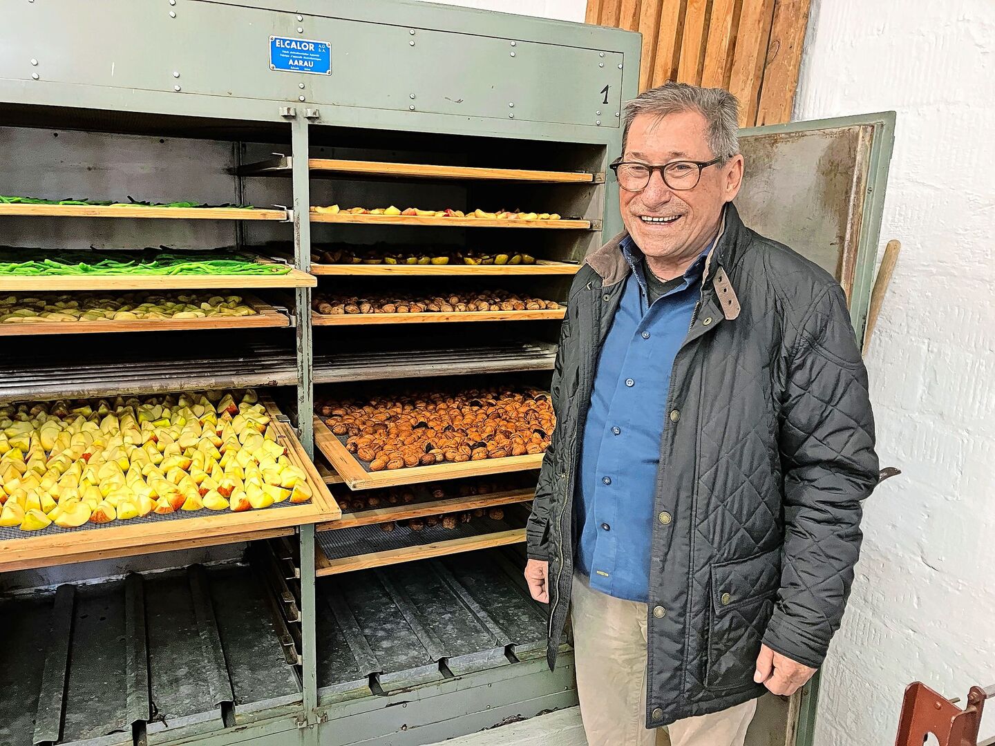 Morgens um zehn vor neun: Kurz bevor Peter Hauri die Türe zur Dörranlage schliesst, kommt die letzte Kundin mit einer Schüssel Bohnen vorbei. Die Frau legt die Hülsenfrüchte sorgfältig auf ein Gitter, das der Dörrmeister anschliessend in den Ofen schiebt. Darin sind bereits Äpfel, Birnen und Baumnüsse parat. Dann kann es losgehen: Hauri heizt die beiden Schränke auf 60 Grad auf. Bald macht sich die Aktivität der Öfen…