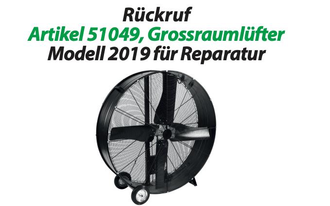 Bei den Grossraumlüftern mit der Artikelnummer 51049 sind Motorenprobleme festgestellt worden. Dadurch kann es zu einem Kurzschluss kommen, wodurch eine Gefahr von Stromschlägen und Bränden besteht.