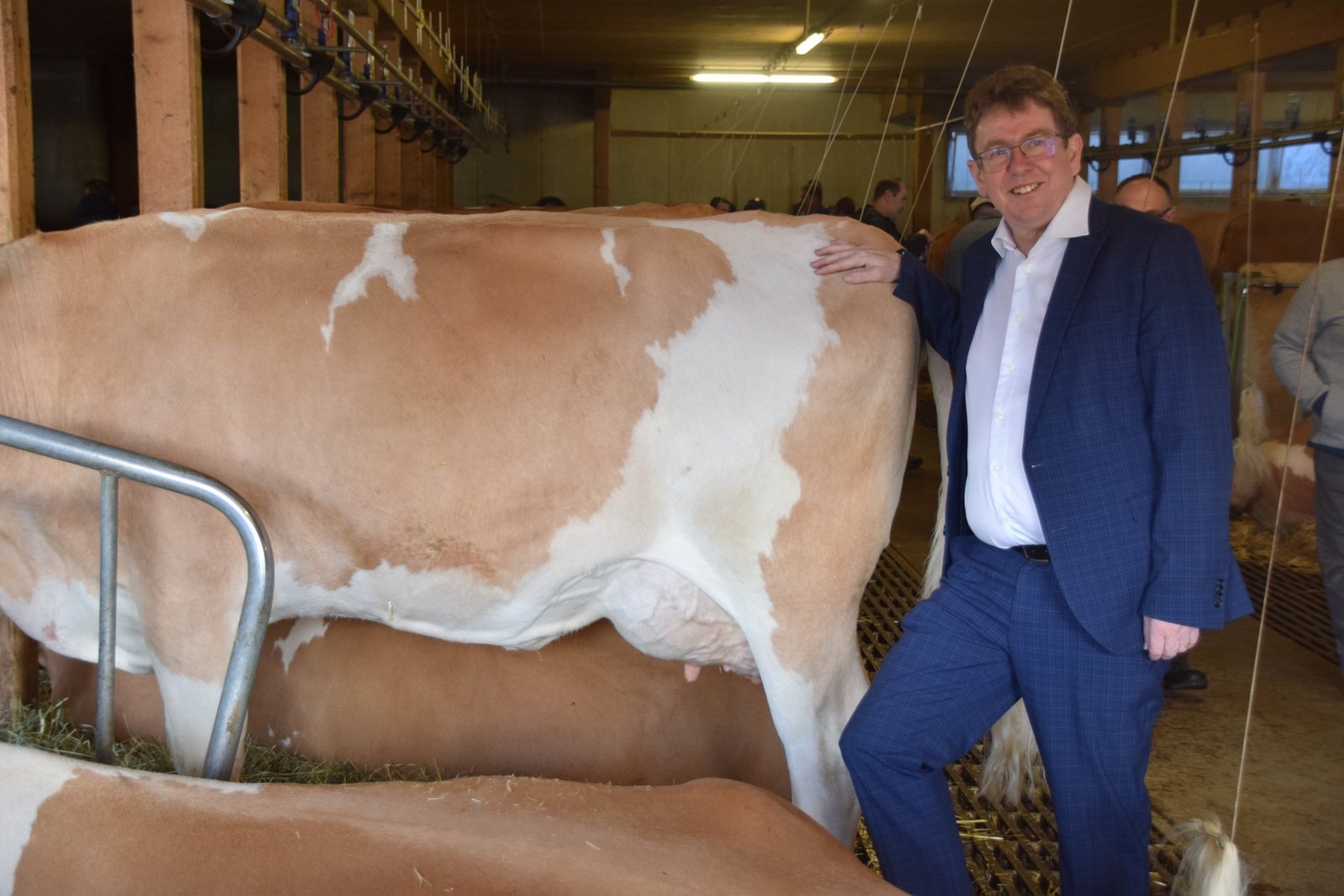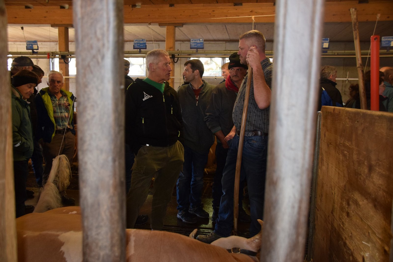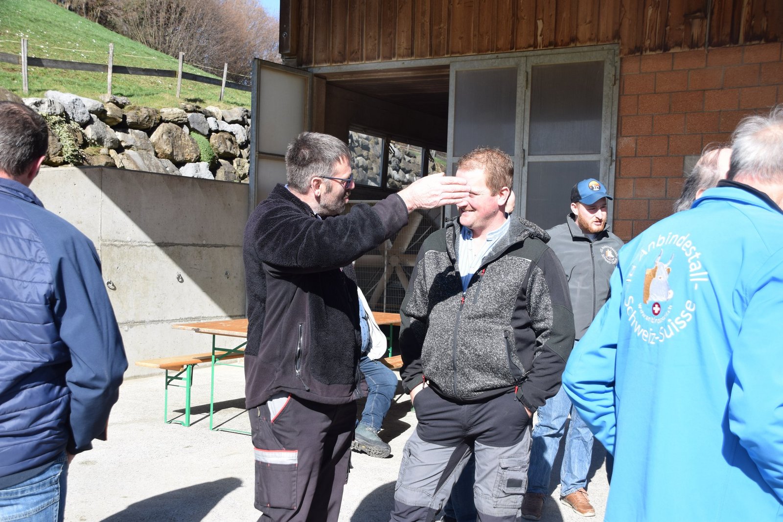 Am Nachmittag wurde der schöne Reinzuchtbetrieb von Roland und Brigitte Knutti in Riggisberg BE besucht. Auch Knutti hält seine Kühe in einem Anbindestall. Die Tiere sind in einem tadellosen Zustand, eingestreut in viel Stroh, fühlen sie sich sprichwörtlich «sauwohl». Auf dem Betrieb Knutti sprach auch der Bundesrat Albert Rösti zur Versammlung und gratulierte der IG zu ihrem Jubiläum. Und Rösti meinte noch: «Die Familie Knutti hat wunderschöne Kühe hier und ich habe früher zu Hause unseren Kühen auch noch die Schwänze gewaschen», sagte Rösti der Bauernsohn aus dem Berner Oberland lachend.