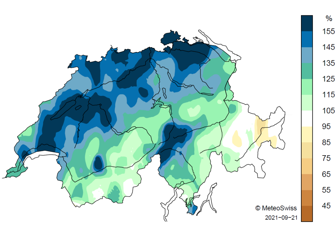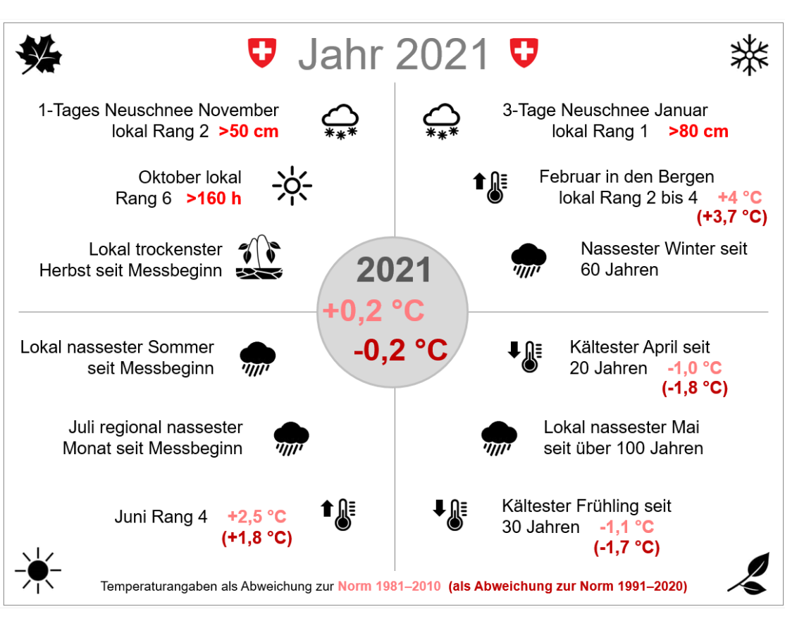 In ähnlichem Stil ging es in den Frühlingsmonaten weiter. Laut MeteoSchweiz erlebte die Schweiz das kälteste Frühjahr seit über 30 Jahren. Ab Mai gab es viel Regen. Der Sommer 2021 gilt als einer der nassesten seit Beginn der Aufzeichnungen, es gab aber wenige Hitzetage und blieb im Durchschnitt vergleichsweise kühl. Je nach Region wurden Regenmengen bis 190 Prozent des üblichen Werts gemeldet. Nördlich der Alpen führten die ständigen Niederschläge gegen Mitte Juli zu Hochwasser und Überschwemmungen.