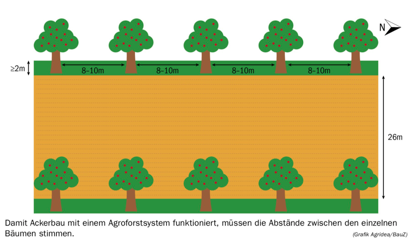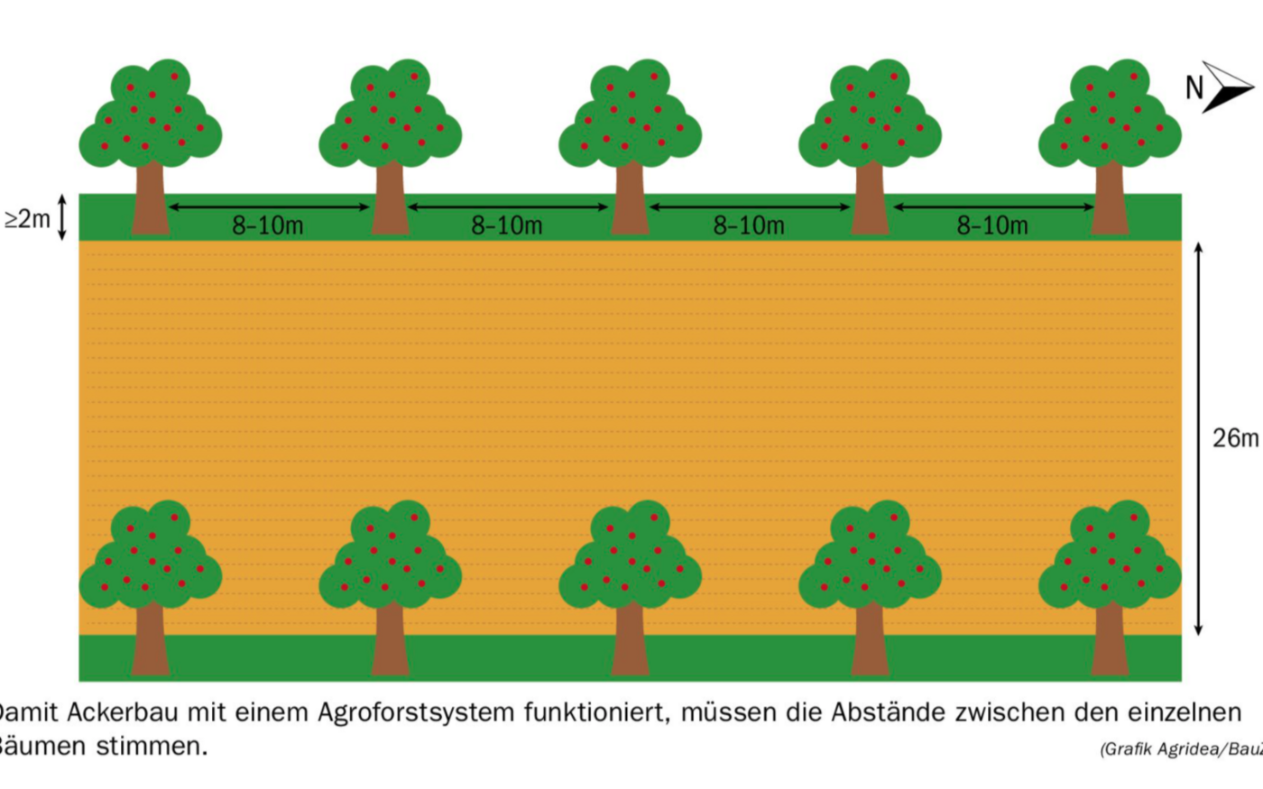 Ein Agroforstsystem muss gut überlegt werden und benötigt vor allem in seinen Anfängen eine intensive Pflege. Die Agridea hat diesbezüglich eine Broschüre entwickelt, in der das Anlegen verschiedener Agroforstsysteme beleuchtet wird. Nachfolgend wird der Fokus auf das Agroforstsystem mit Ackerbau gelegt. Anlegen der Baumreihen Auf einem Ackerbau-Agroforstsystem sollten nach Agridea-Empfehlung zirka 50 Bäume pro…